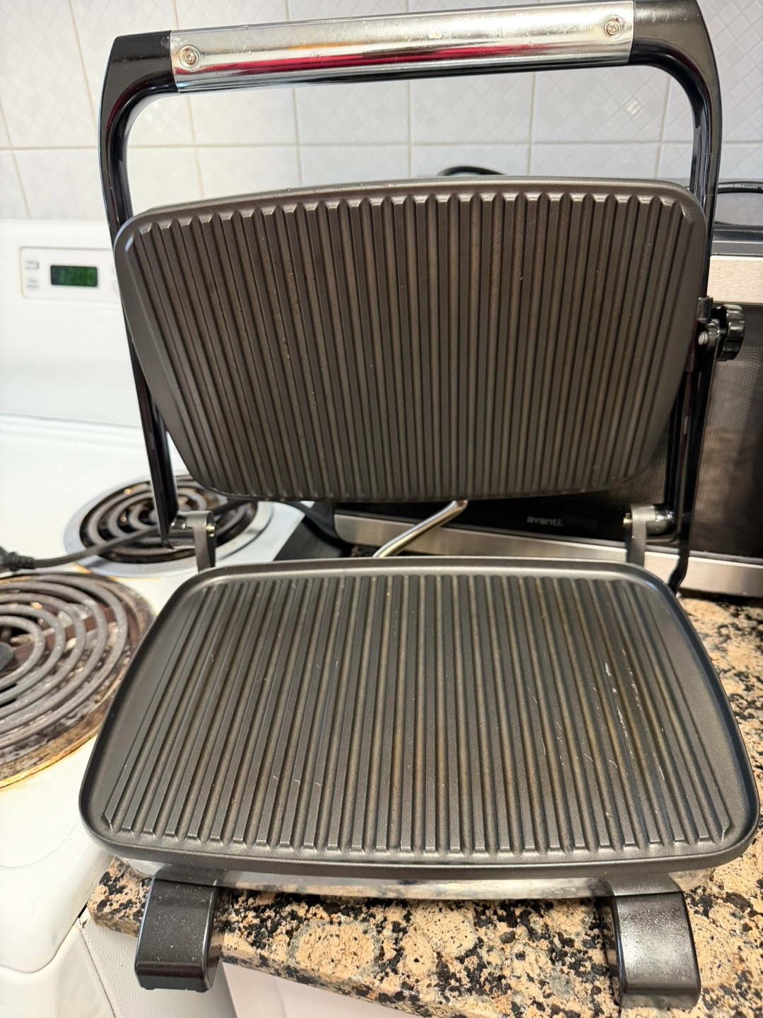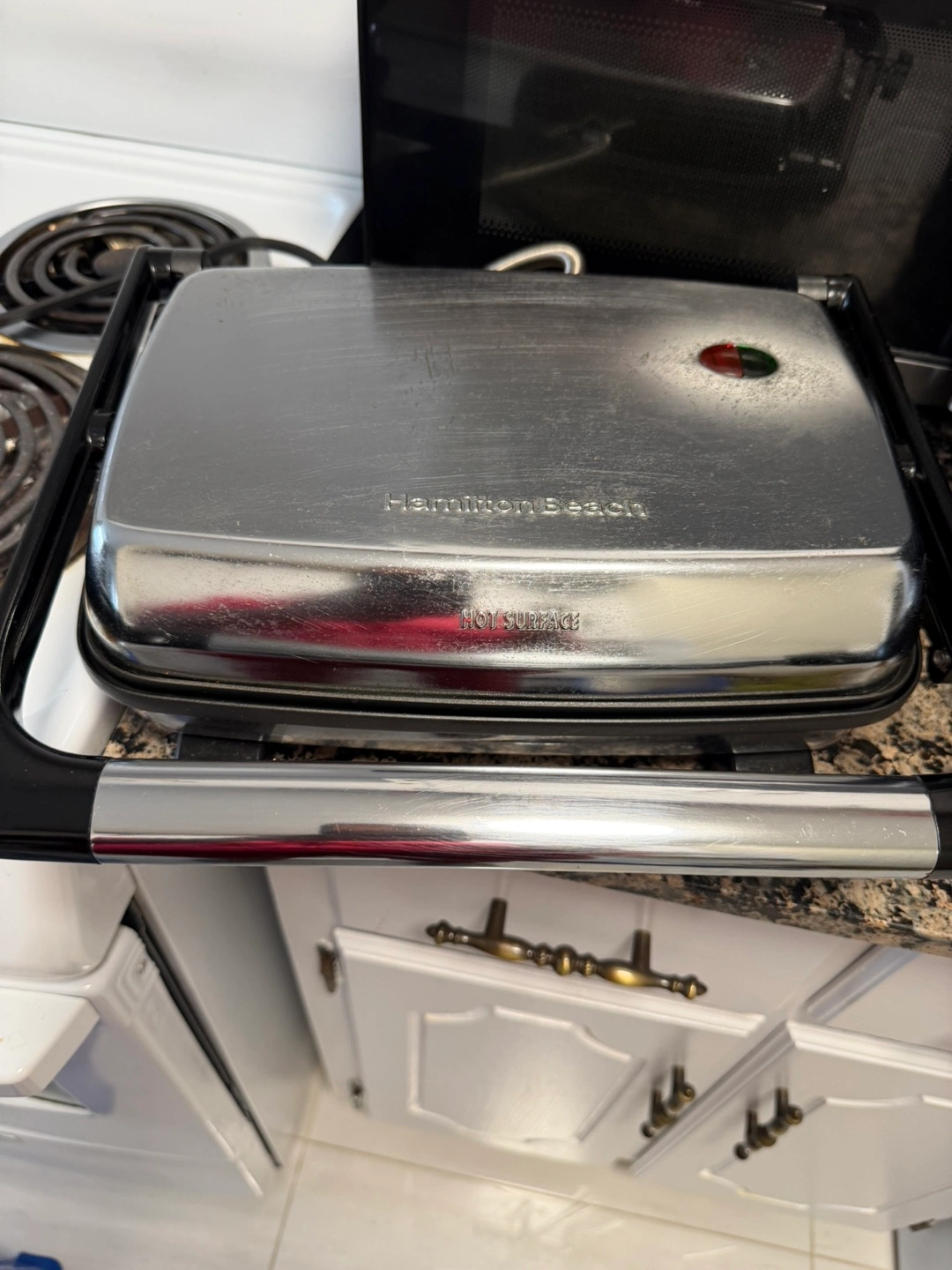 This Hamilton Beach electric grill is great for making sandwiches and grilling meats. It has non-stick plates for easy cleanup. It's compact and easy to store!