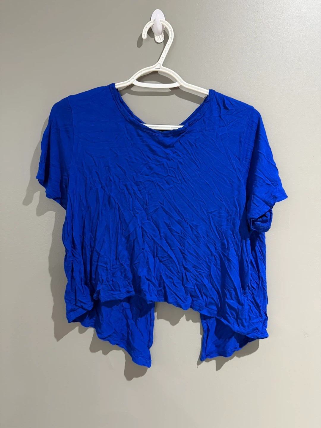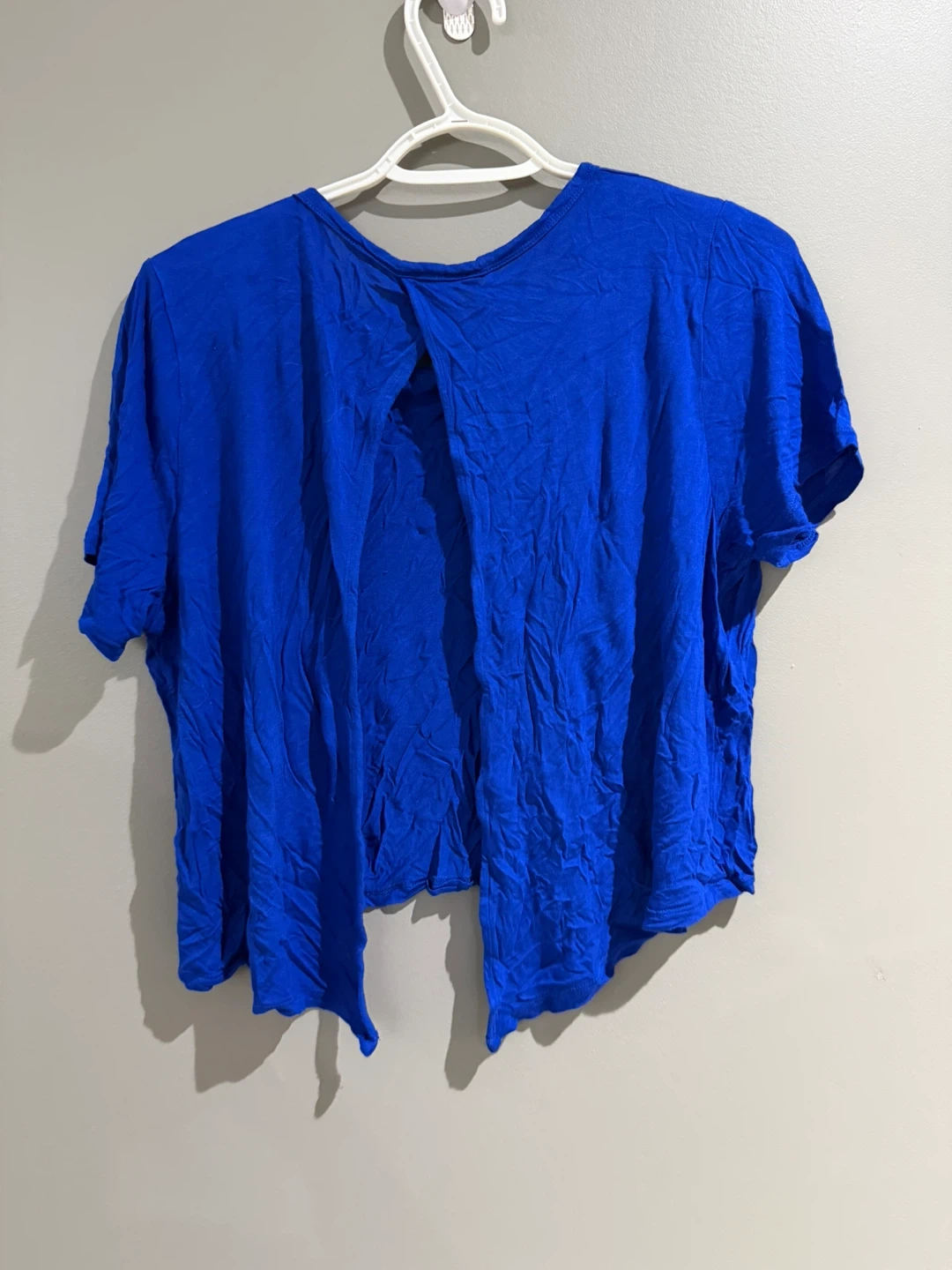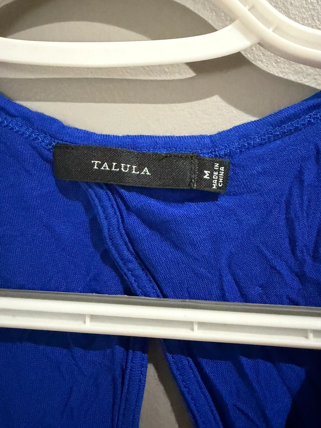 This is a blue Talula t-shirt. It's a size medium. It features a unique open back design.