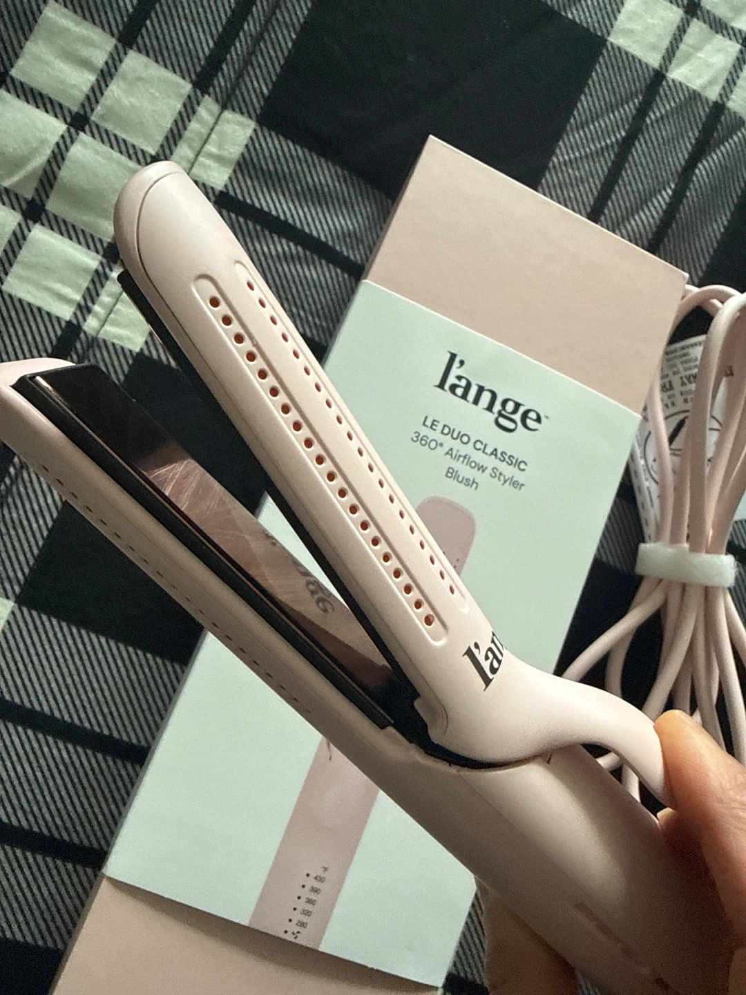 This is the L'ange Le Duo Classic 360° Airflow Styler in blush pink. It features adjustable temperature settings up to 430°F. It also comes with its original box and pouch. This styler is great for creating smooth, sleek hair quickly!