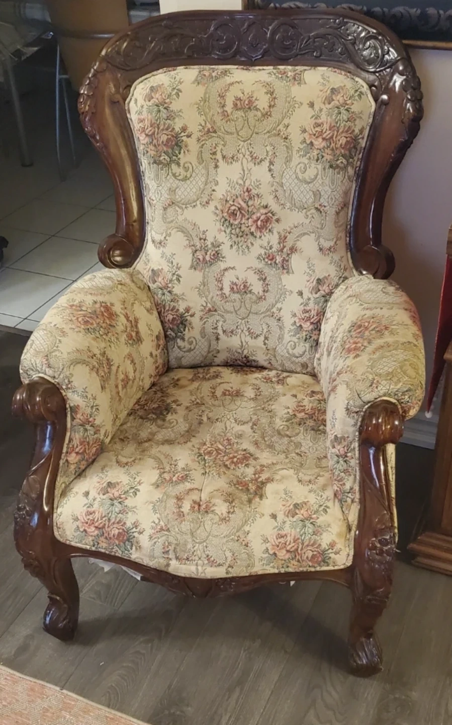 Vintage Armchair with Floral Upholstery and Carved Wood Frame