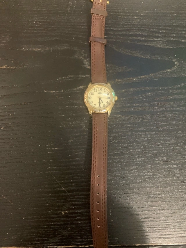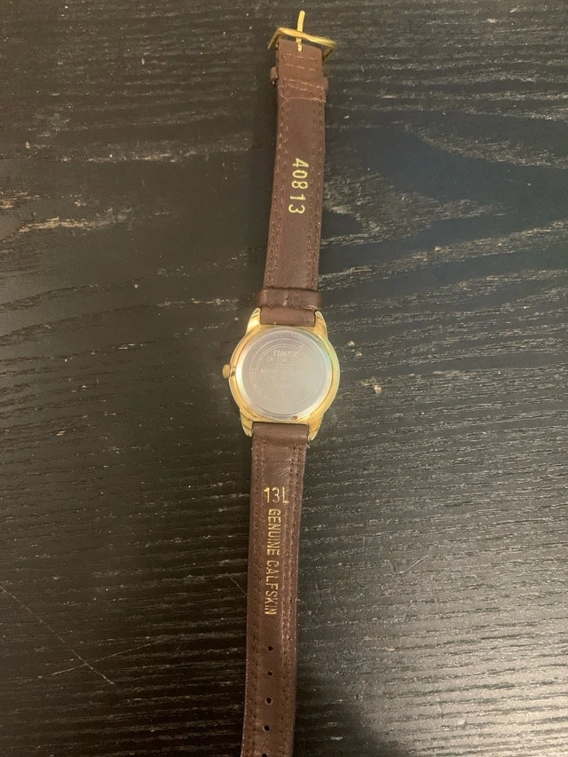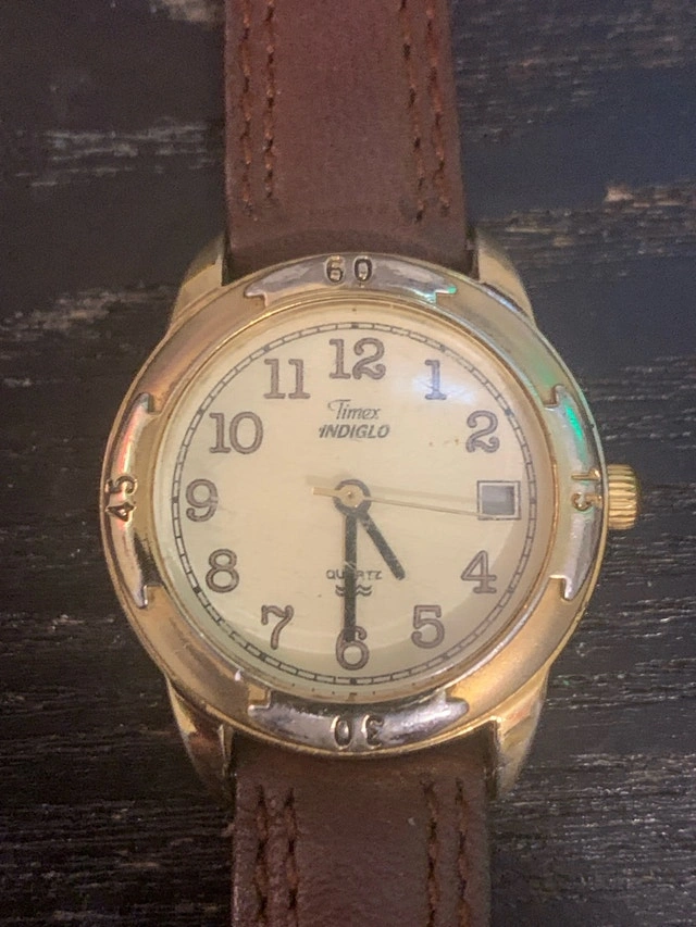 I'm selling a Timex Indiglo watch with a gold-tone case and a brown leather band. It has a classic look and the Indiglo feature lights up the dial for easy reading in the dark. This is a used watch. Brand: Timex, Model: Indiglo, Case Colour: Gold, Band Colour: Brown. This watch has been telling me the time, but maybe you can give it a new wrist to call home! If this ad is still up, it means the watch is still available.