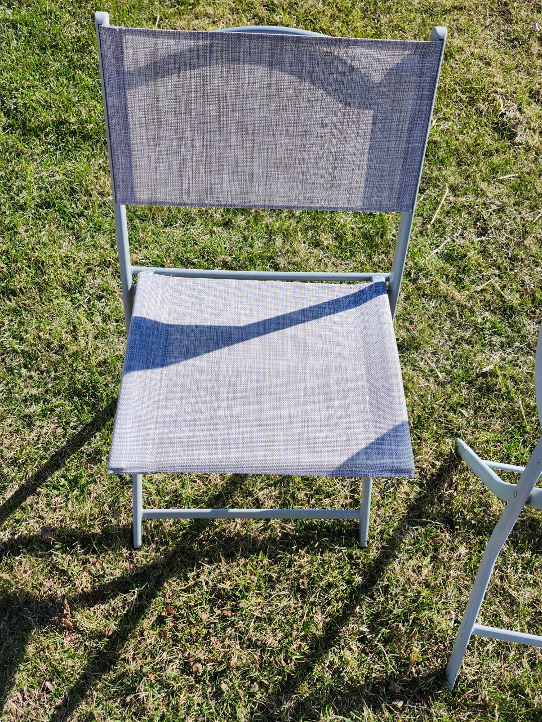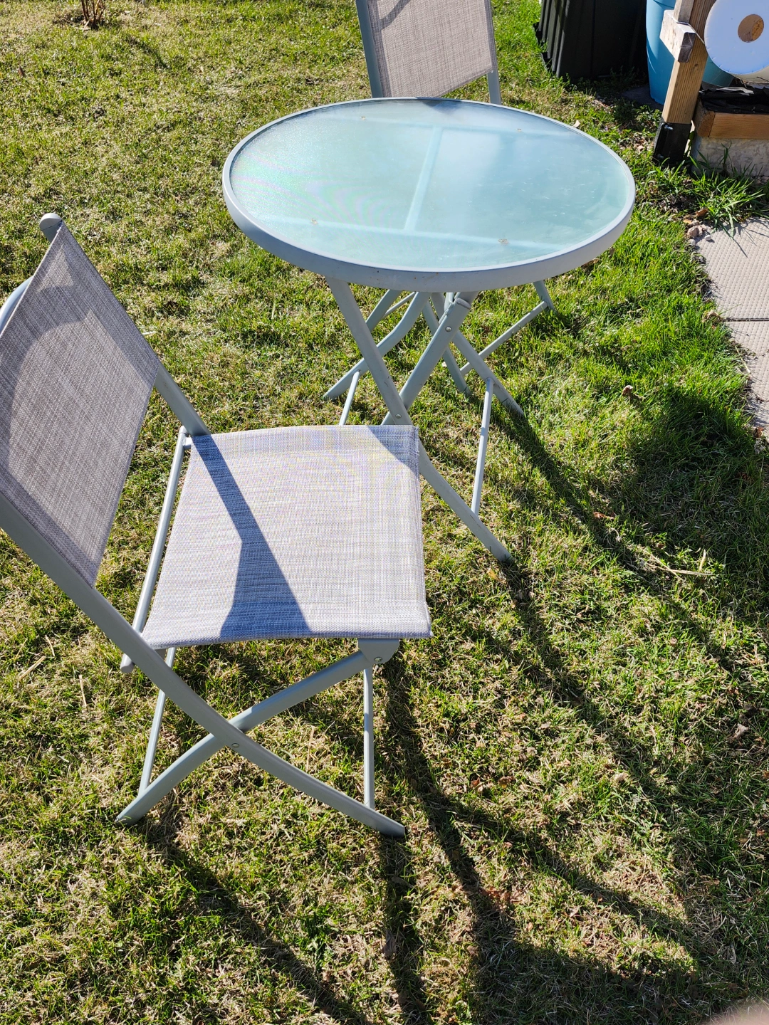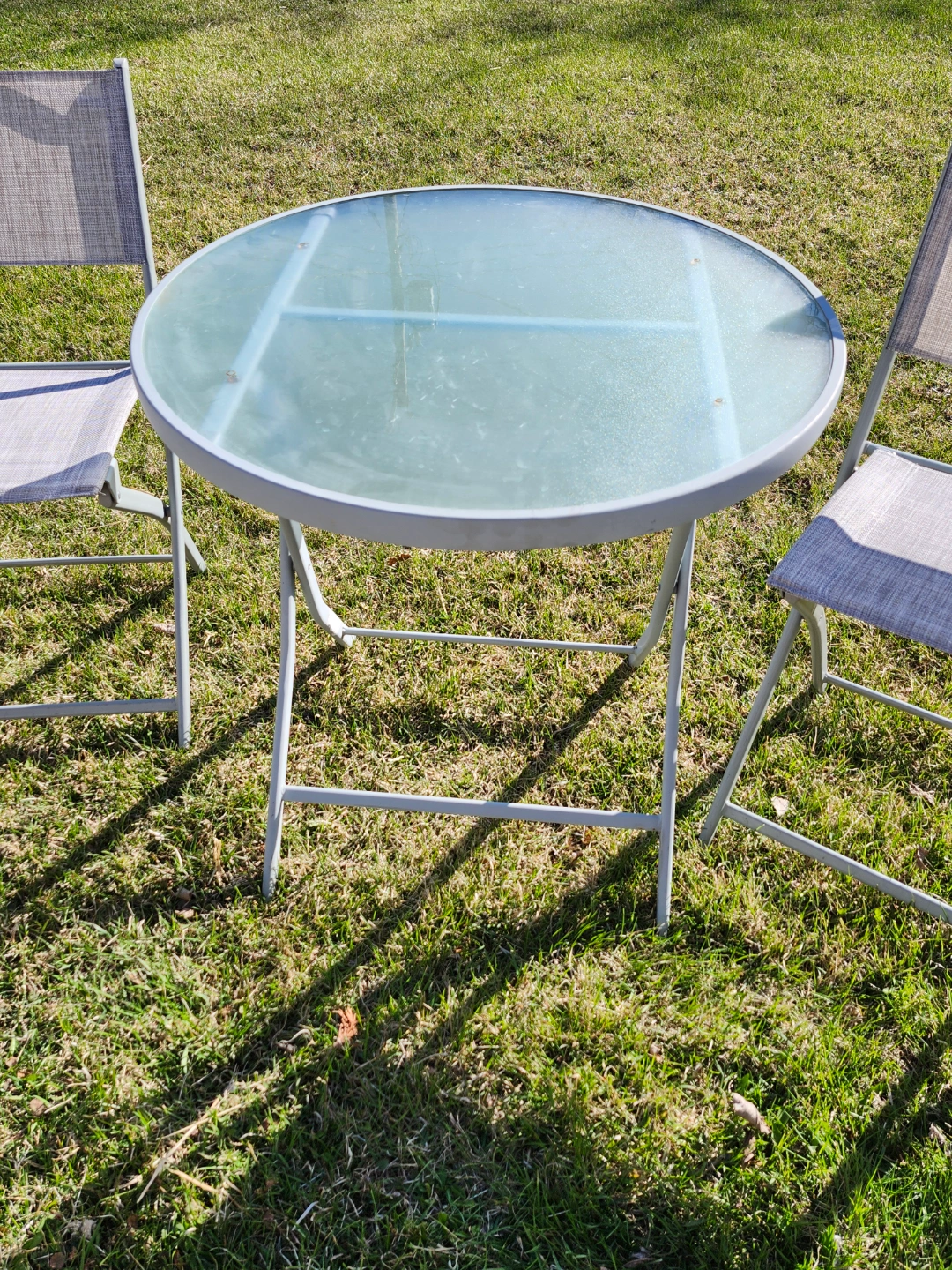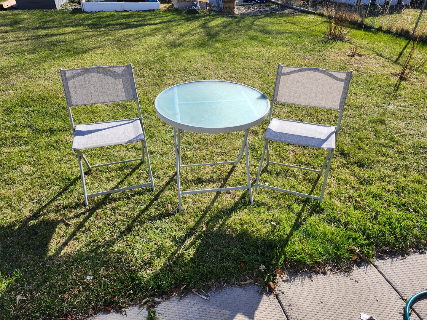 Small patio set, perfect for a balcony or small space. Includes two folding chairs and a small round glass-top table. Grey metal frame and light beige fabric seats. Easy to store.