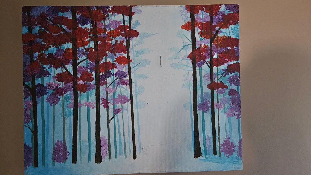 This is a hand-painted art piece depicting a tranquil forest scene. The painting features trees with red and purple leaves against a blue and white background. It would be a lovely addition to any room!
