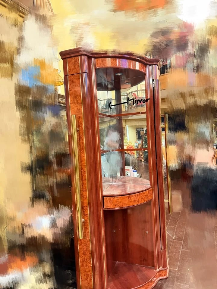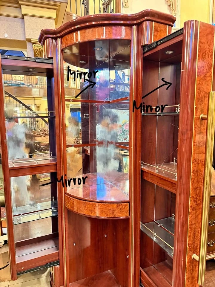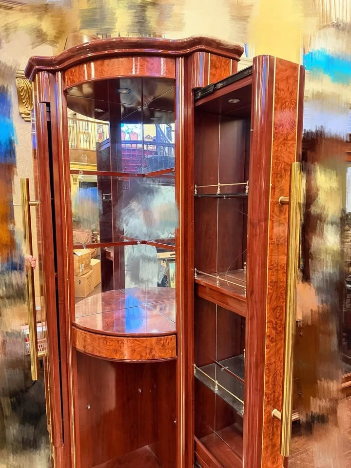 Rich reddish-brown wood with a high-gloss finish, featuring curved glass panels, mirrored backing, and elegant brass handles. Classic vintage style with beautiful wood grain throughout, in excellent condition, clean and well maintained, with smooth doors and sturdy shelving.