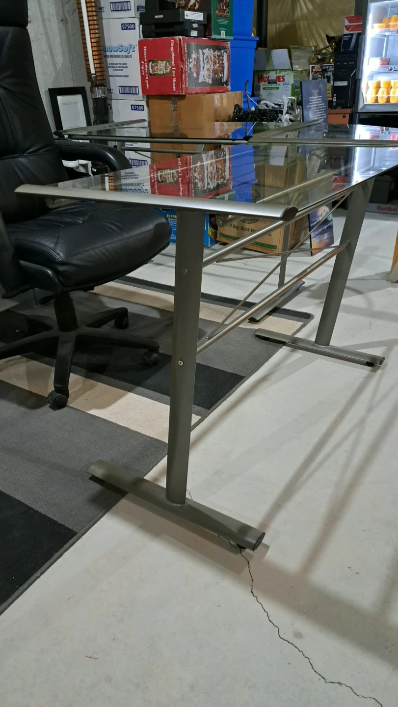 This glass computer desk is perfect for a home office or student. Its sleek design and sturdy construction make it a great addition to any workspace. This desk is in great condition, ready to enhance your productivity and style.