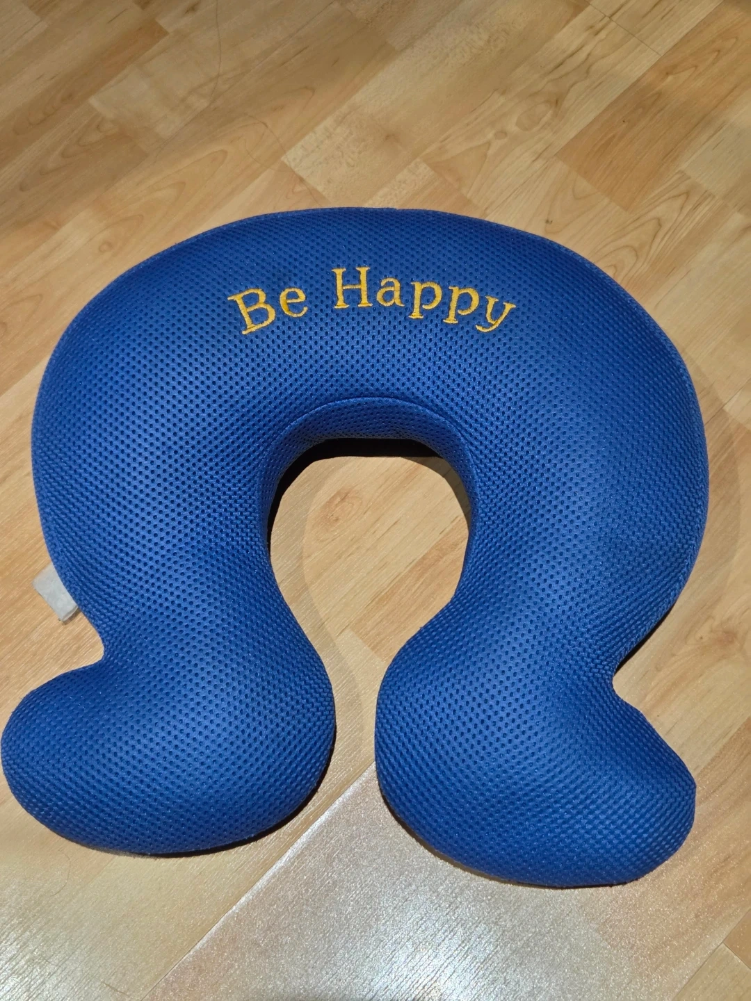 This travel neck pillow is a vibrant blue and features "Be Happy" embroidered in yellow. Its mesh-like outer material is breathable. It's shaped for comfort during travel.