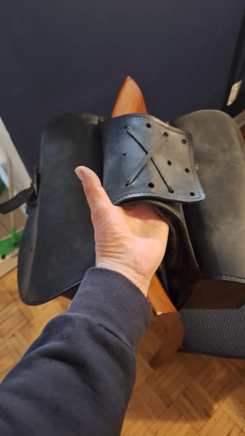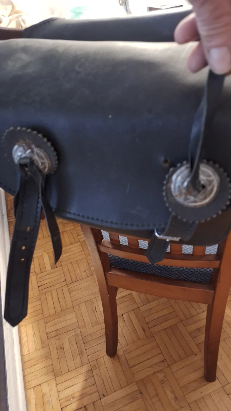 These are black leather saddlebags for a motorcycle. They're made of durable leather and feature decorative concho details. Straps for attachment are included.