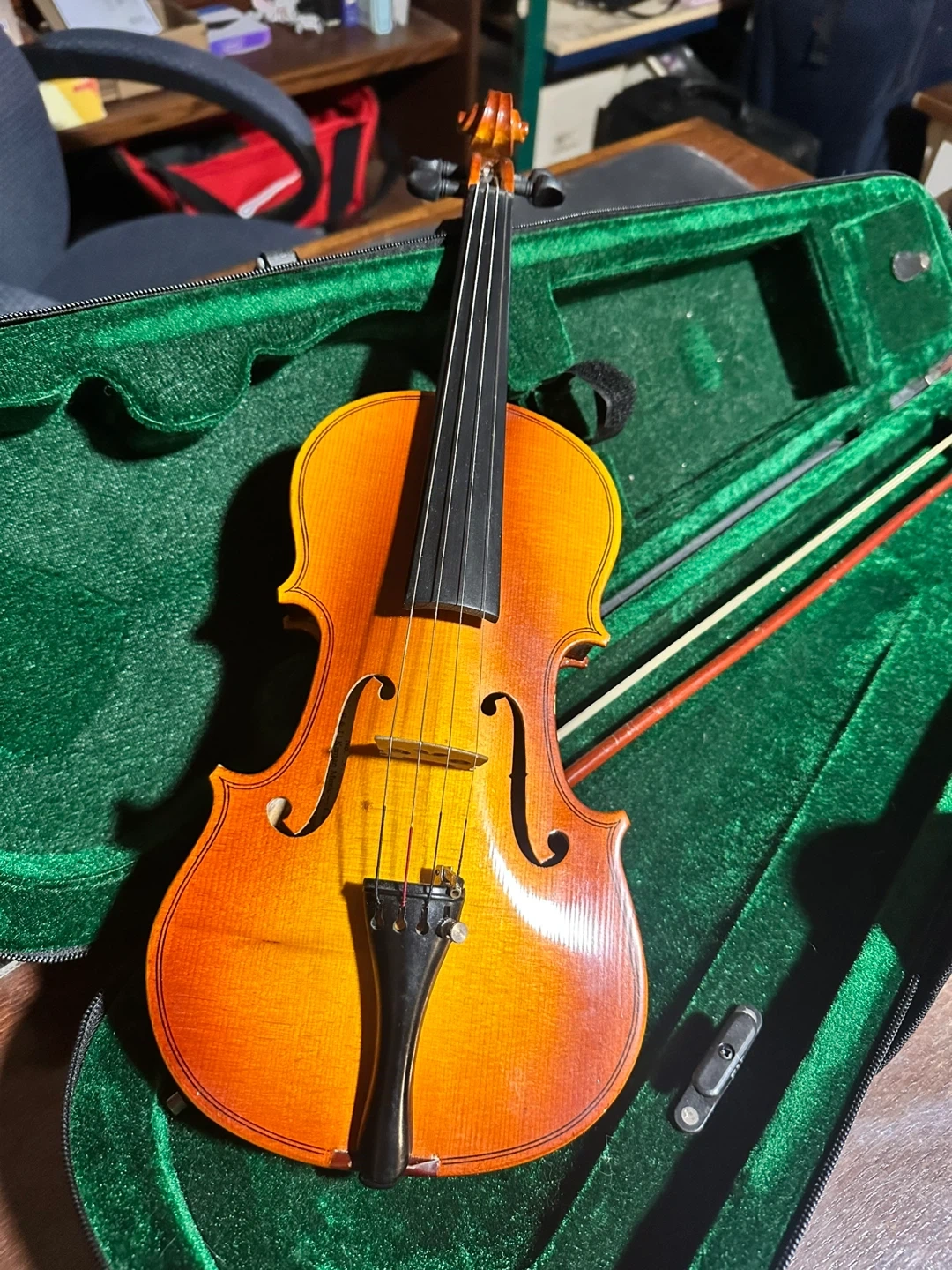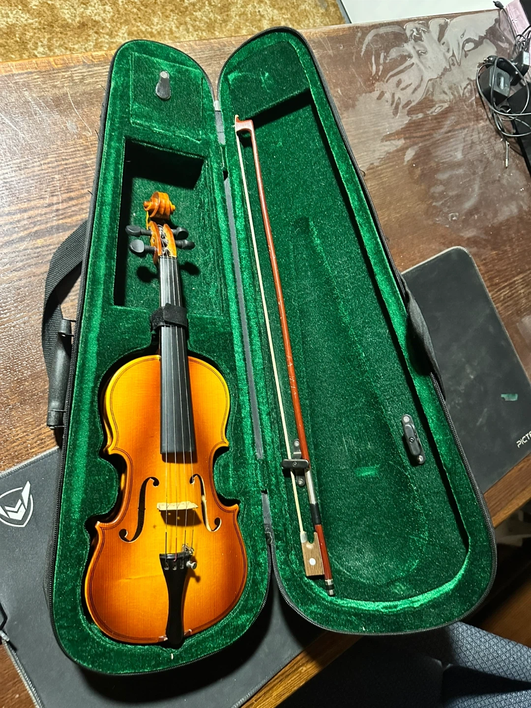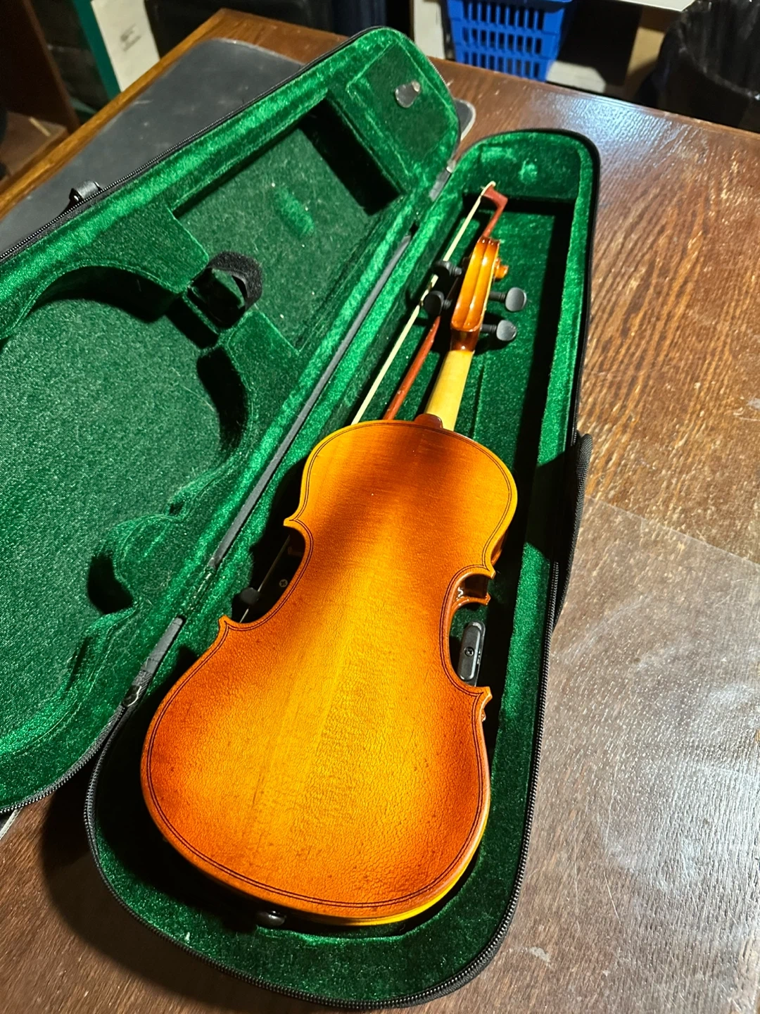 This is a 18” violin, complete with a bow and a protective case. It's a classic instrument for learning or playing music. Comes with a plush-lined case.
