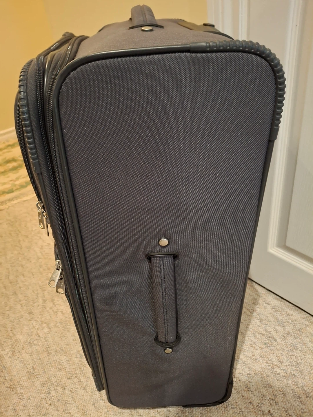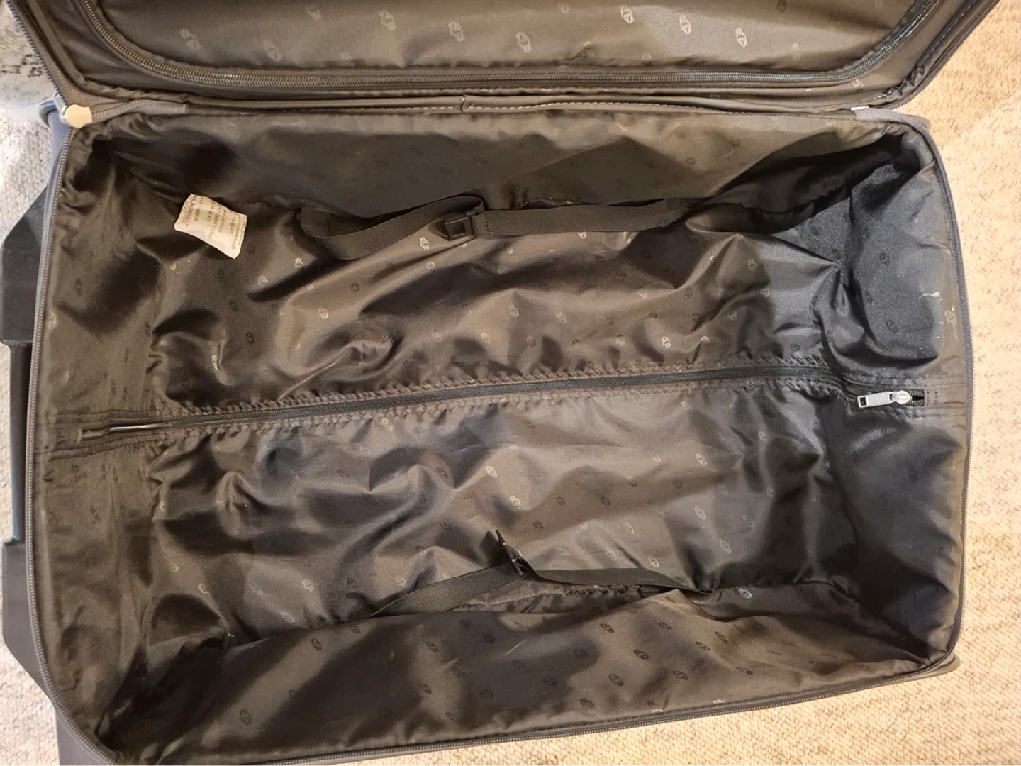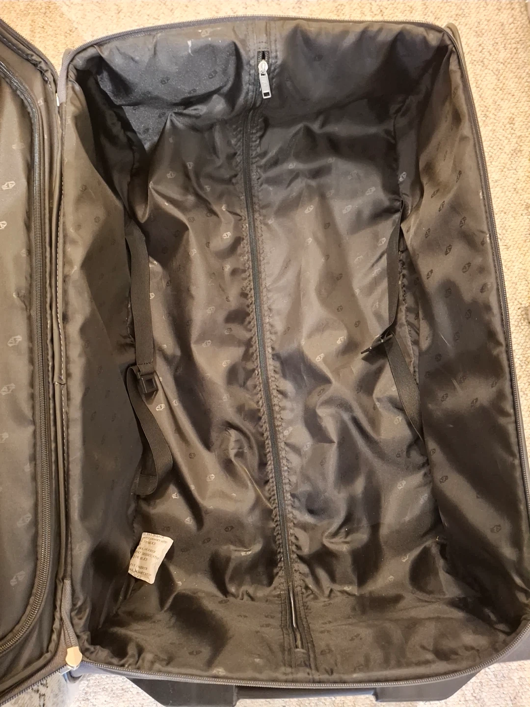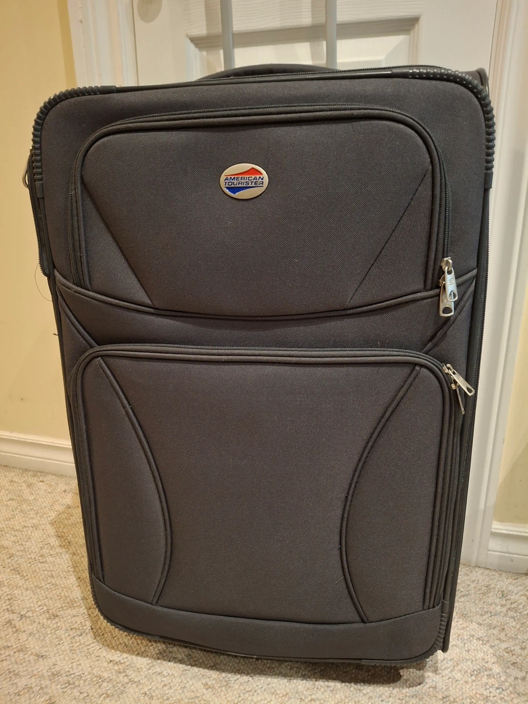American Tourister suitcase, 26” to base by 16” across, 10” deep from front to back. Condition is like brand new (likely only used once). Zippered outside pockets, inside zippered section and straps.