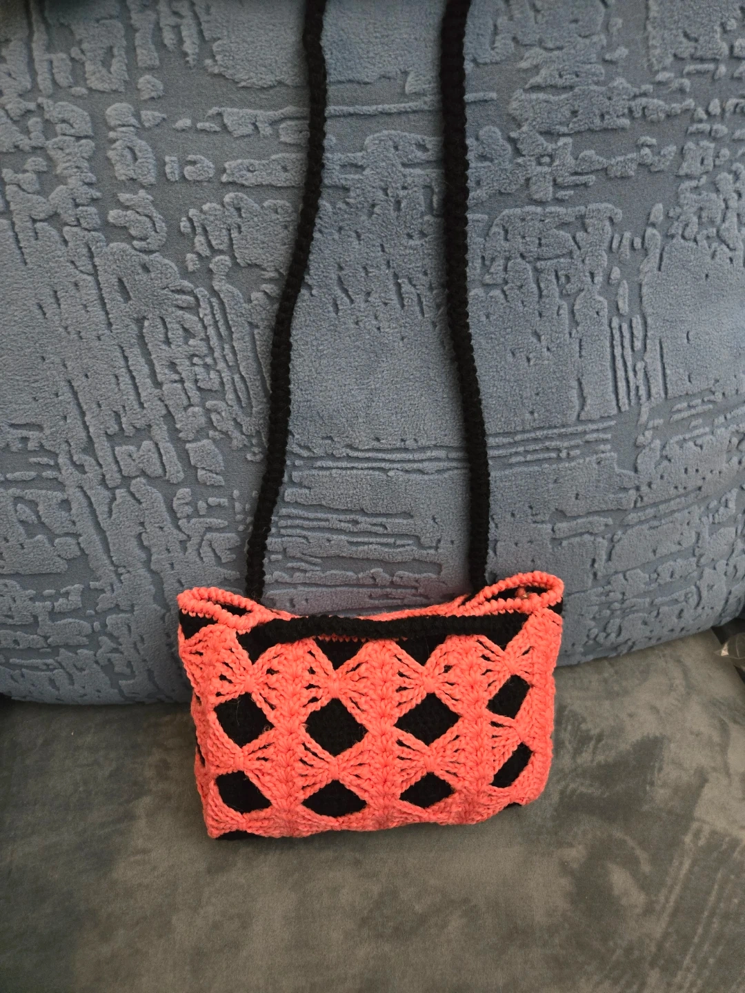 handmade crochet purse in a beautiful coral pink and black colour. Has a diamond pattern throughout. The braided straps are sturdy, comfortable and allow the purse to be worn as a crossbody/shoulder purse or a handbag