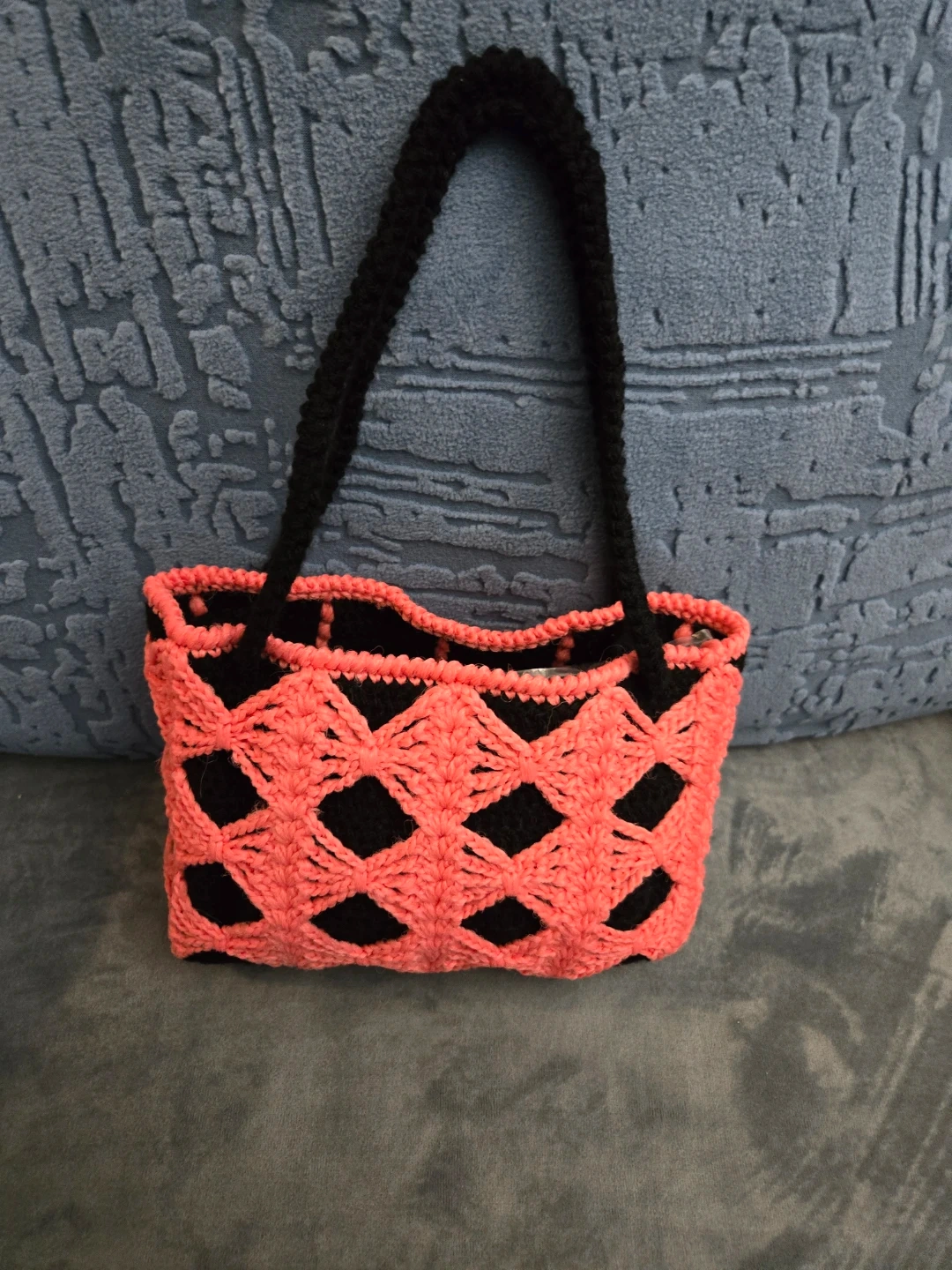 handmade crochet purse in a beautiful coral pink and black colour. Has a diamond pattern throughout. The braided straps are sturdy, comfortable and allow the purse to be worn as a crossbody/shoulder purse or a handbag