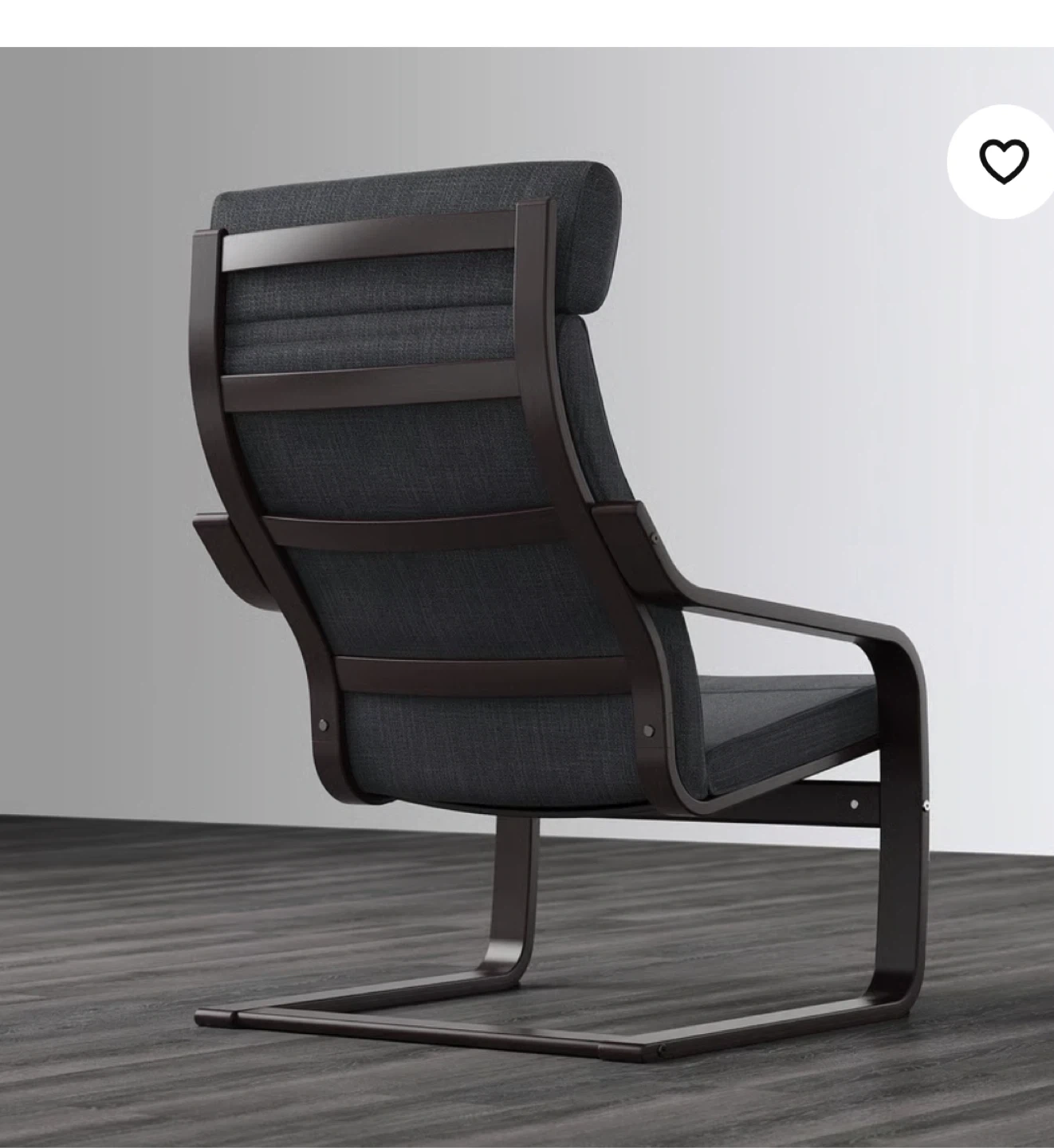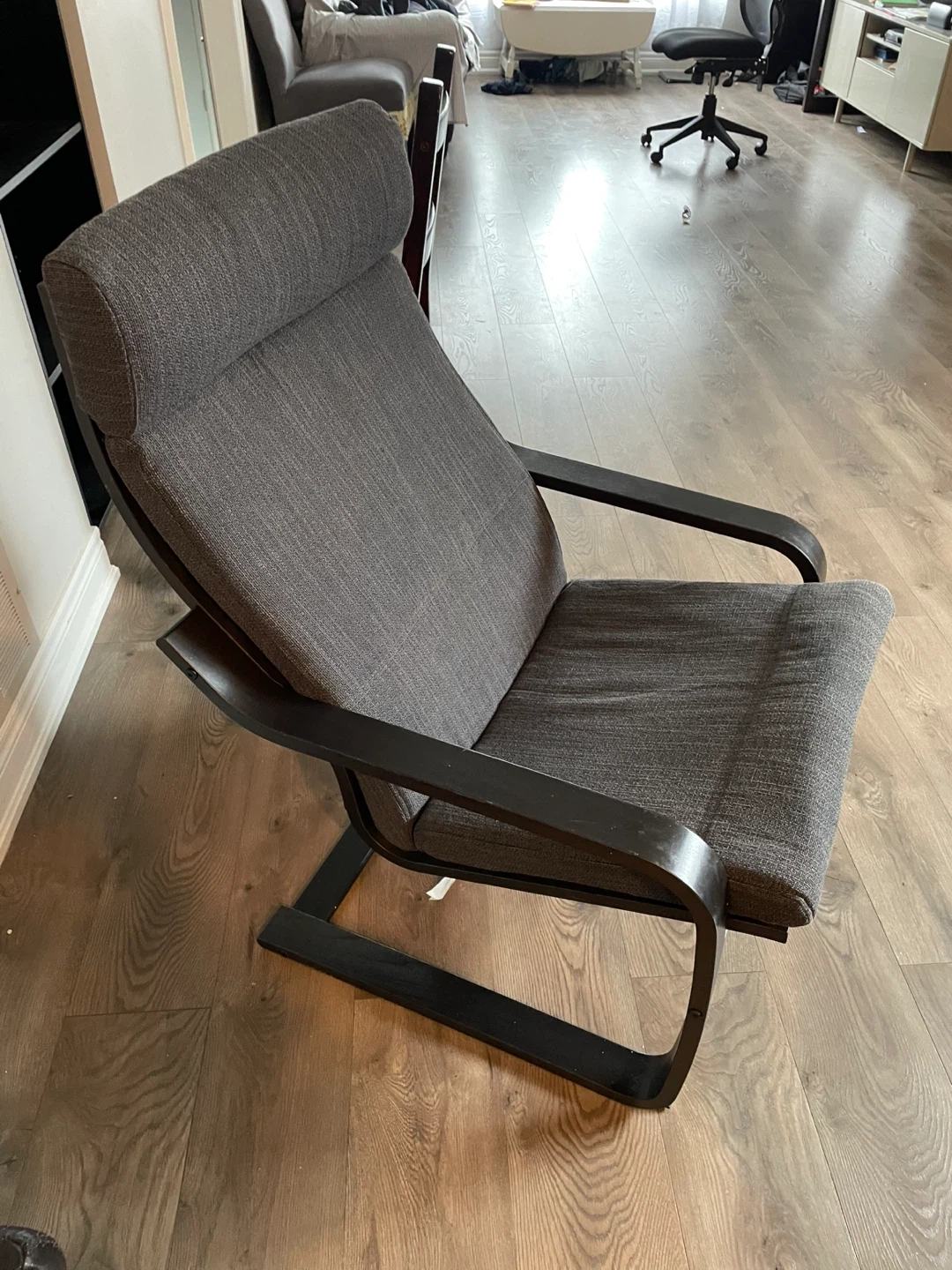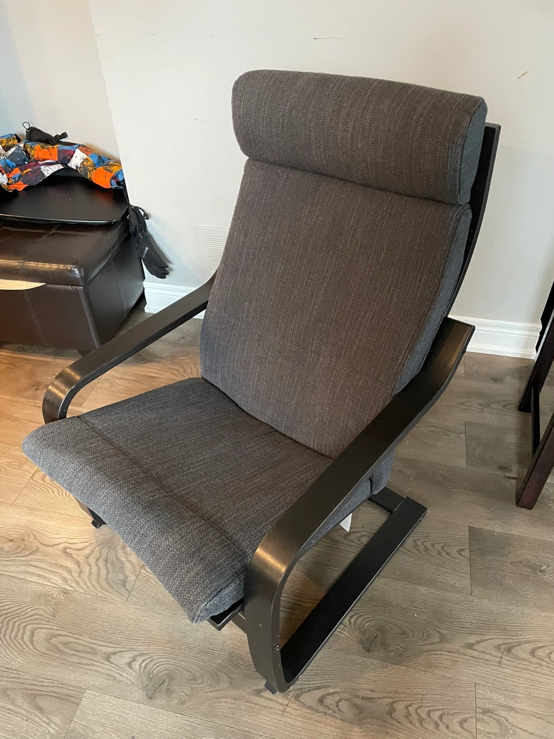 This is an IKEA POÄNG armchair in the Hillared anthracite fabric. It has a black-brown frame and a comfortable high back. It's a great chair for relaxing or reading.