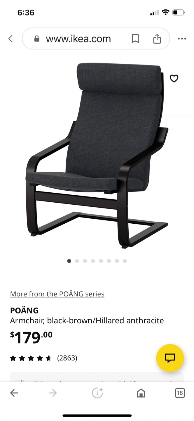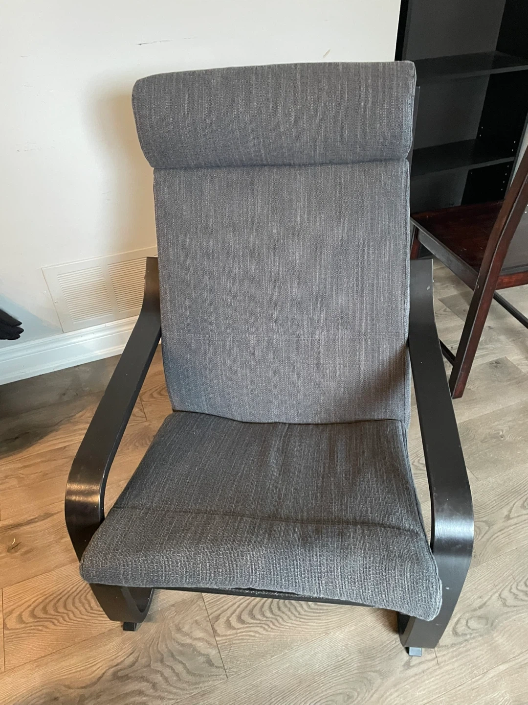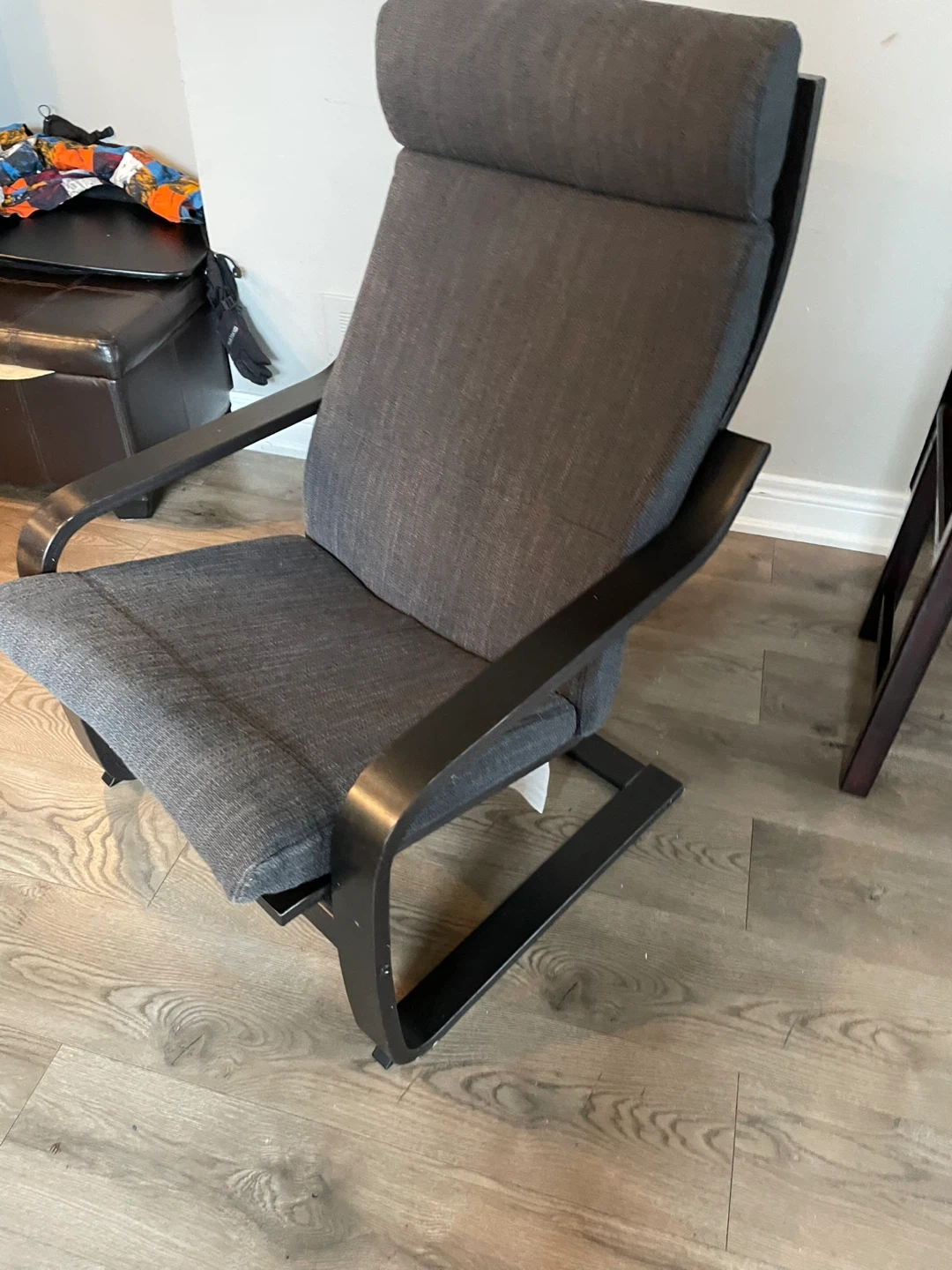 This is an IKEA POÄNG armchair in the Hillared anthracite fabric. It has a black-brown frame and a comfortable high back. It's a great chair for relaxing or reading.