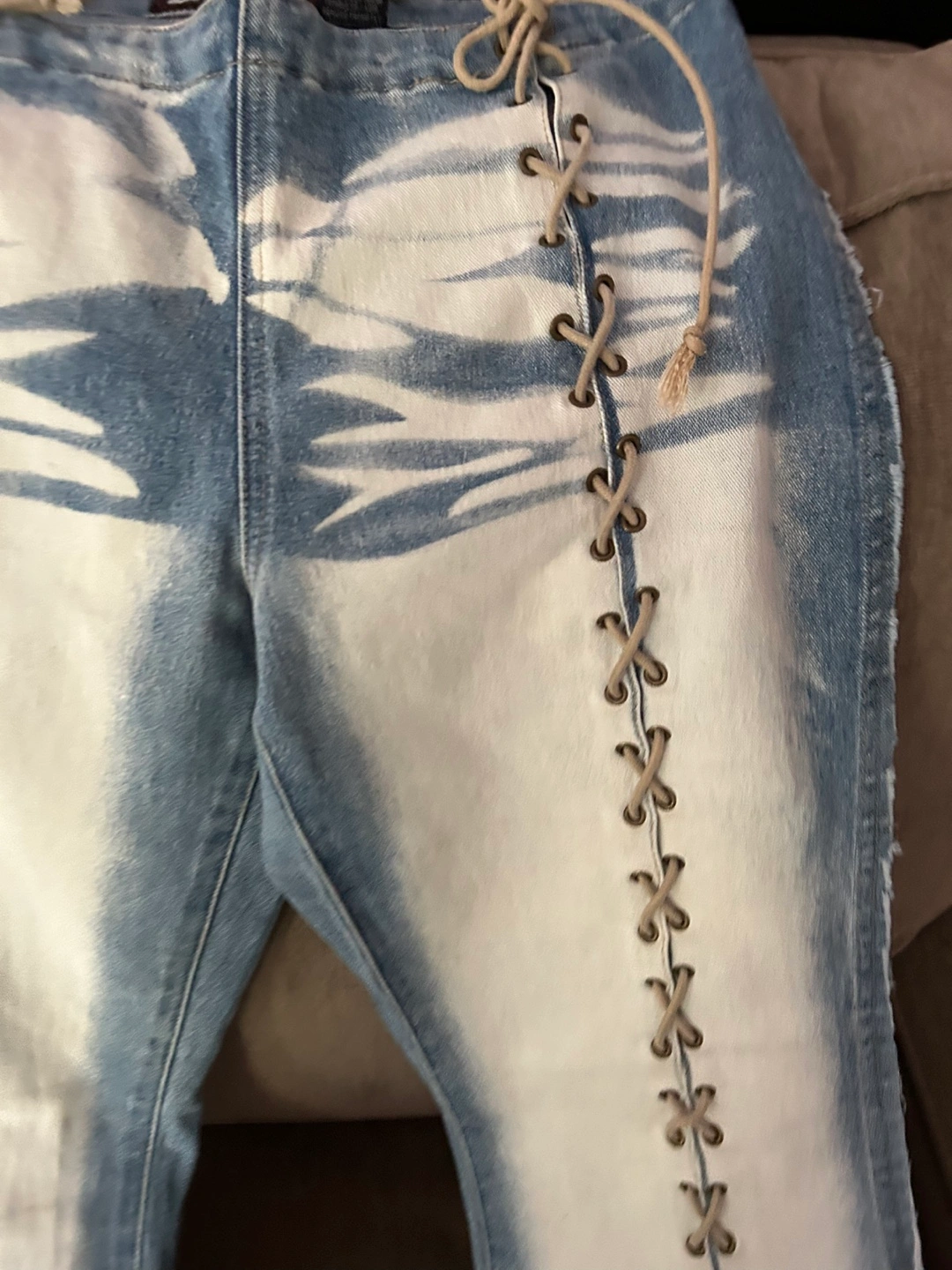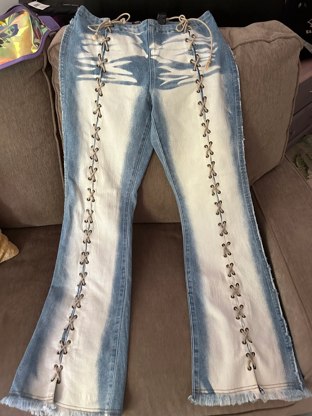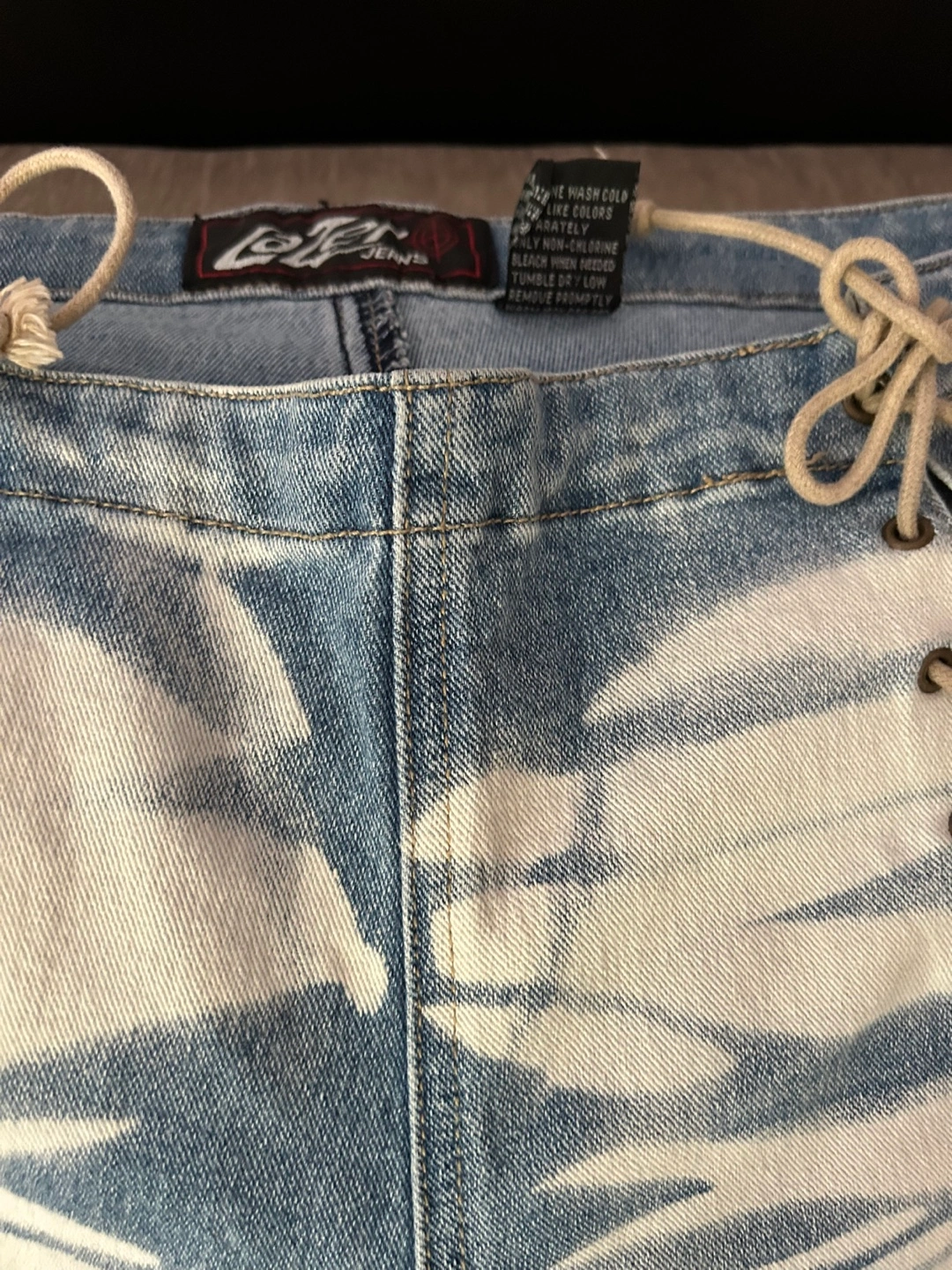 These Lot29 jeans are a unique addition to any wardrobe! The light denim wash with white accents is really eye-catching. They're a size 7 and made of 60% cotton, 36% polyester, and 4% spandex, making them comfy and stretchy