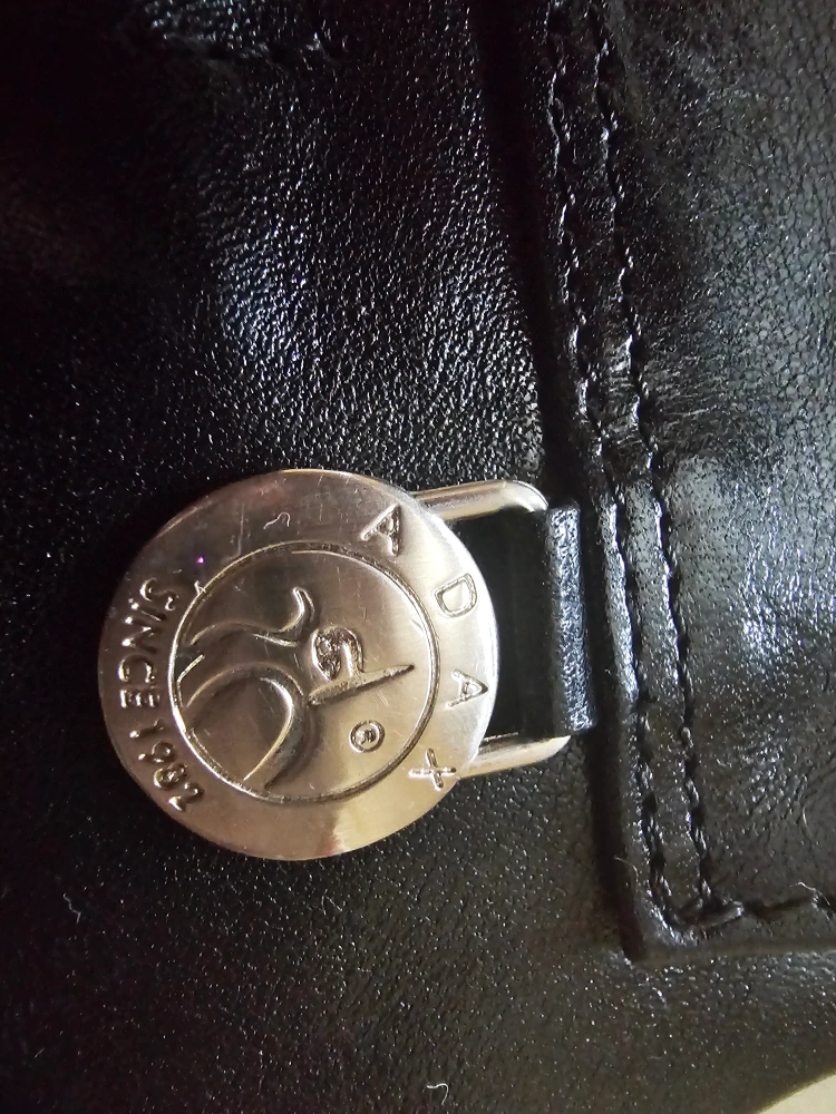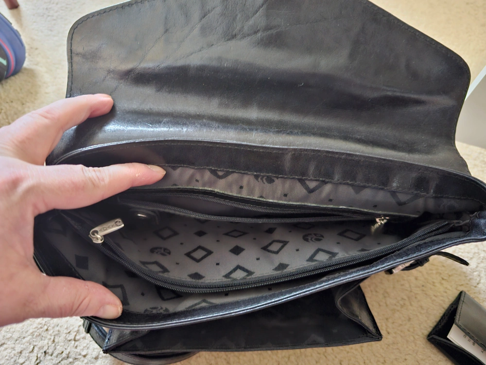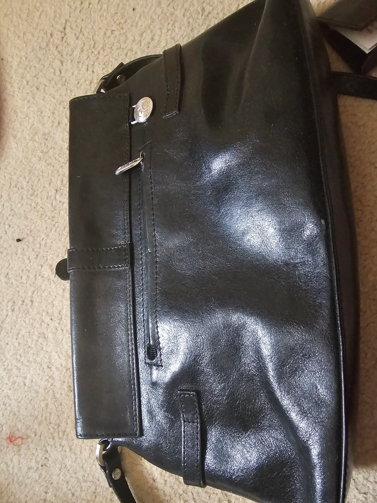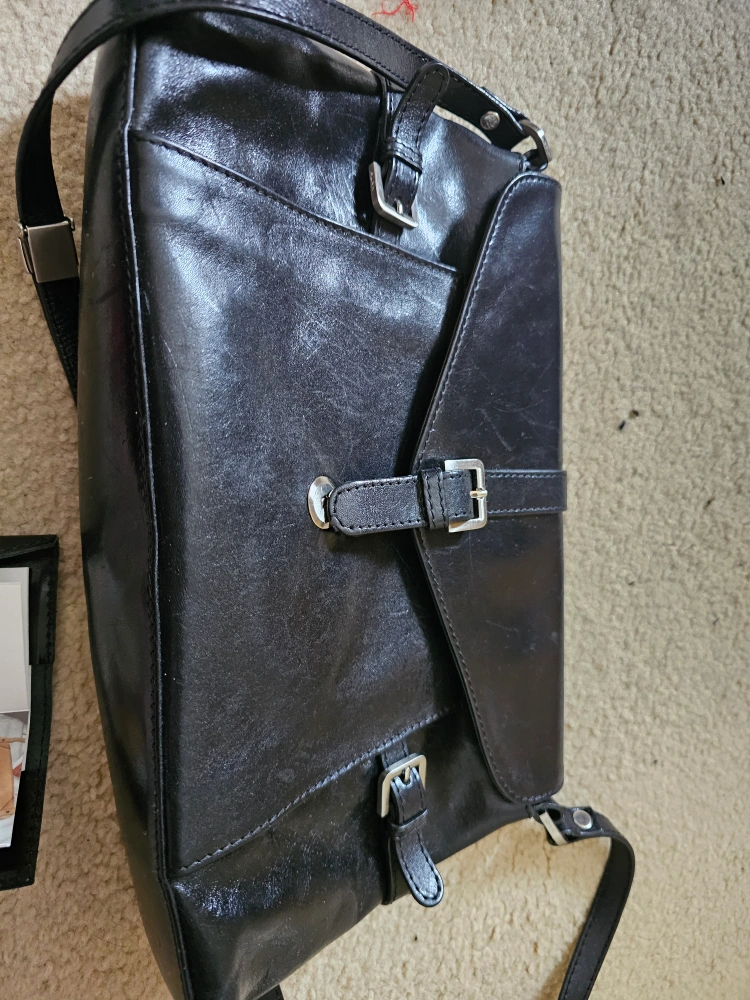 30Black leather shoulder bag. Flap closure with buckle detail. Interior features multiple compartments and pockets. Adjustable shoulder strap. Pre-owned, good condition.