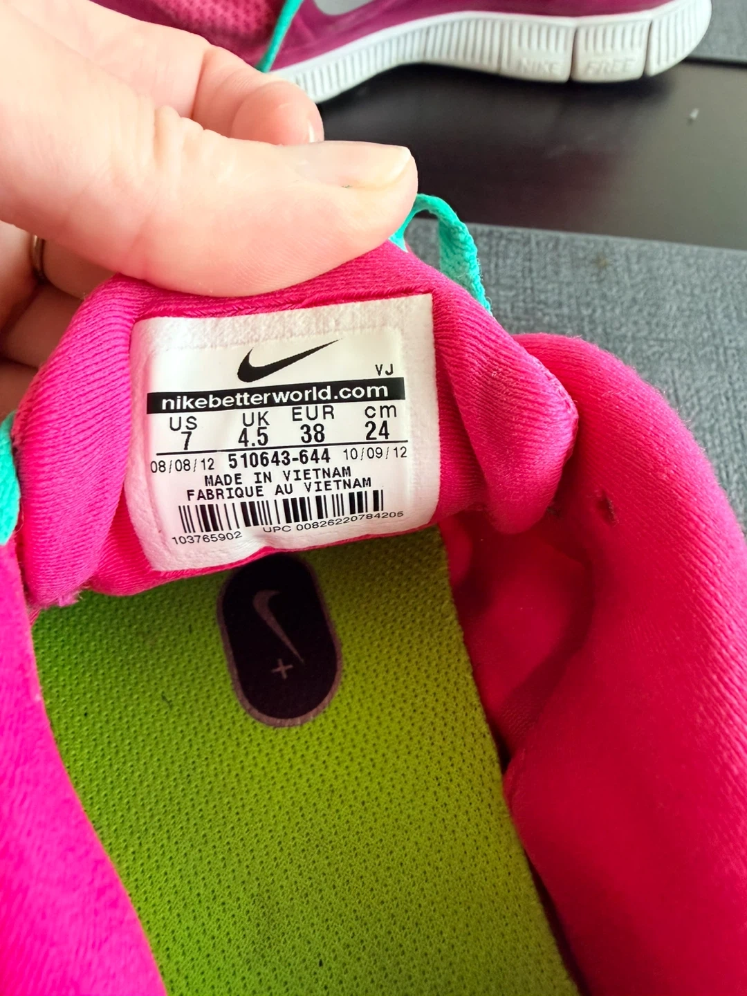 Nike Free Run 3.0 running shoes in a vibrant pink with teal laces. They're a women's US size 7, UK 4.5, EUR 38, and CM 24. Made in Vietnam. These shoes are great for running or everyday wear!