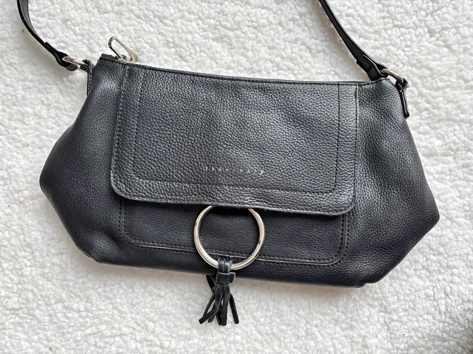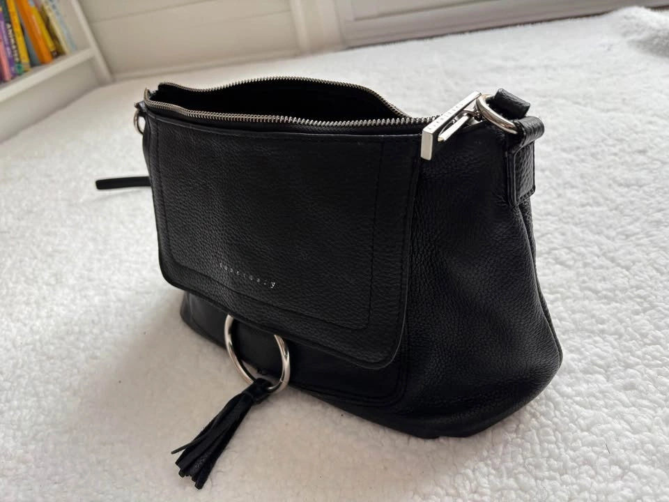 Elegant Sanctuary black soft leather shoulder bag with a stylish ring detail. In pristine condition. Approximately 12x7 inches with lots of pockets to store your things and a long adjustable strap measuring 22-29 inch drop.