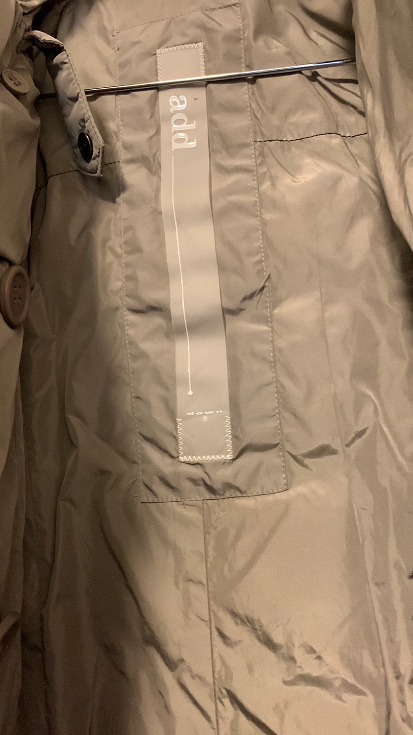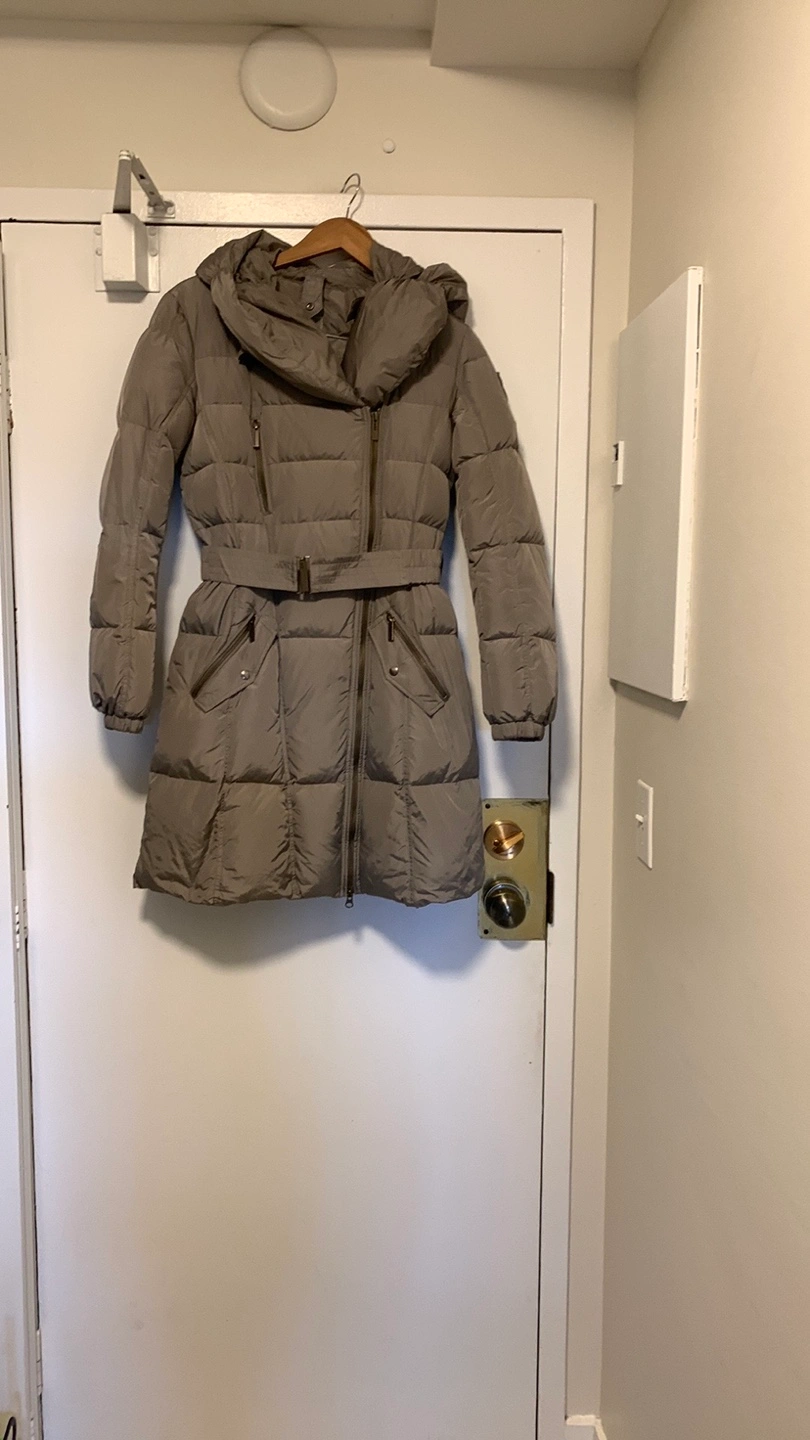 127Add down puffer coat in a neutral colour. It features a belted waist and a hood. Perfect for staying warm and stylish during the colder months!