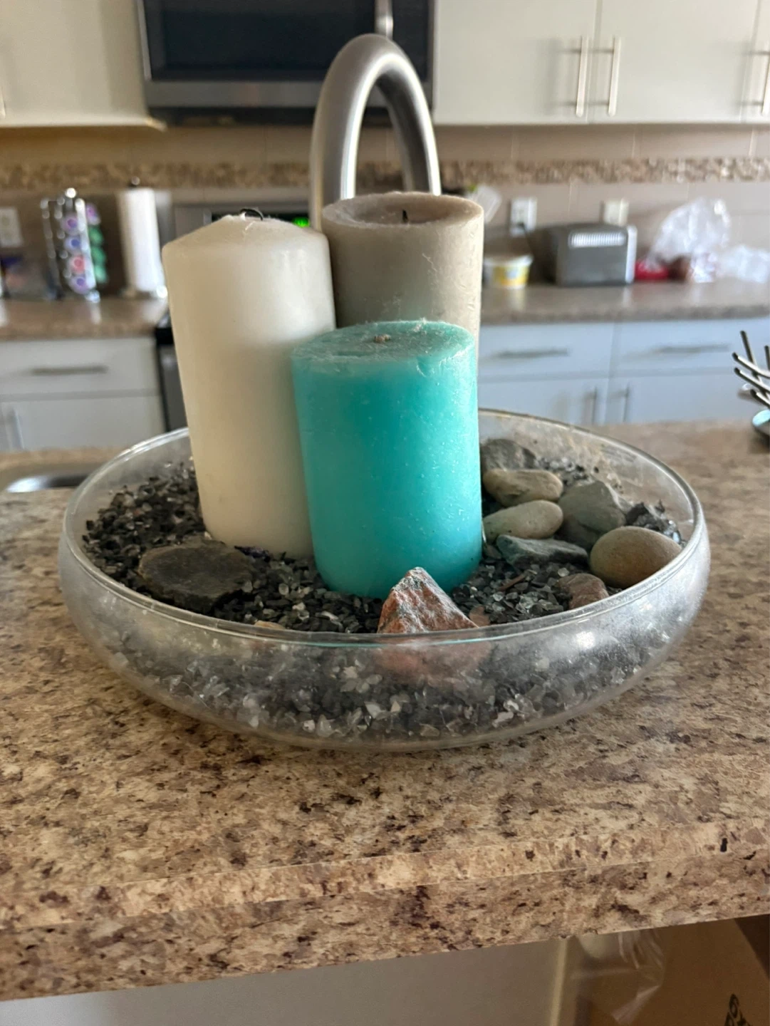 A glass bowl filled with pebbles and decorative stones, holding three pillar candles in white, teal, and grey. Adds a touch of rustic charm to any space.