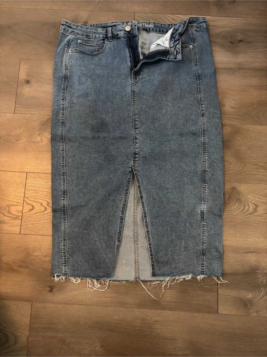 25Selling a Denim jean skirt! It's a light wash denim with a slit in the front. The bottom hem is frayed. Perfect for a casual look! Premium stretch Denim line from Addition Elle