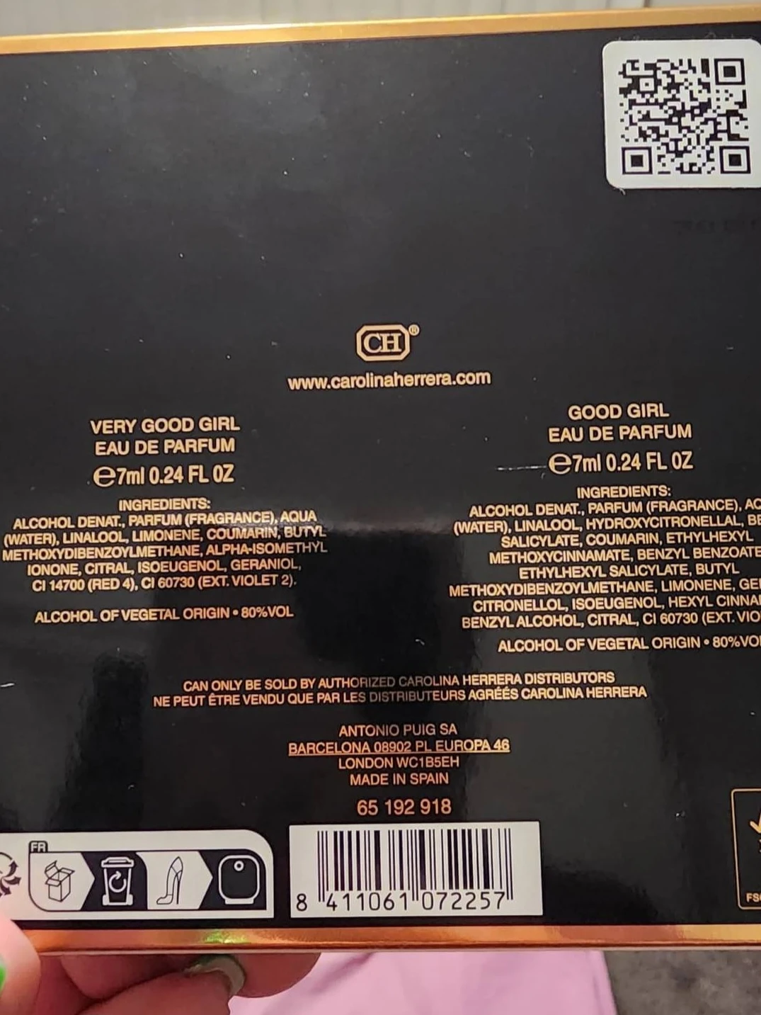 This gift set includes two bottles of Carolina Herrera Good Girl Eau de Parfum, each 7ml (0.24 fl oz). Both fragrances are made in Spain.