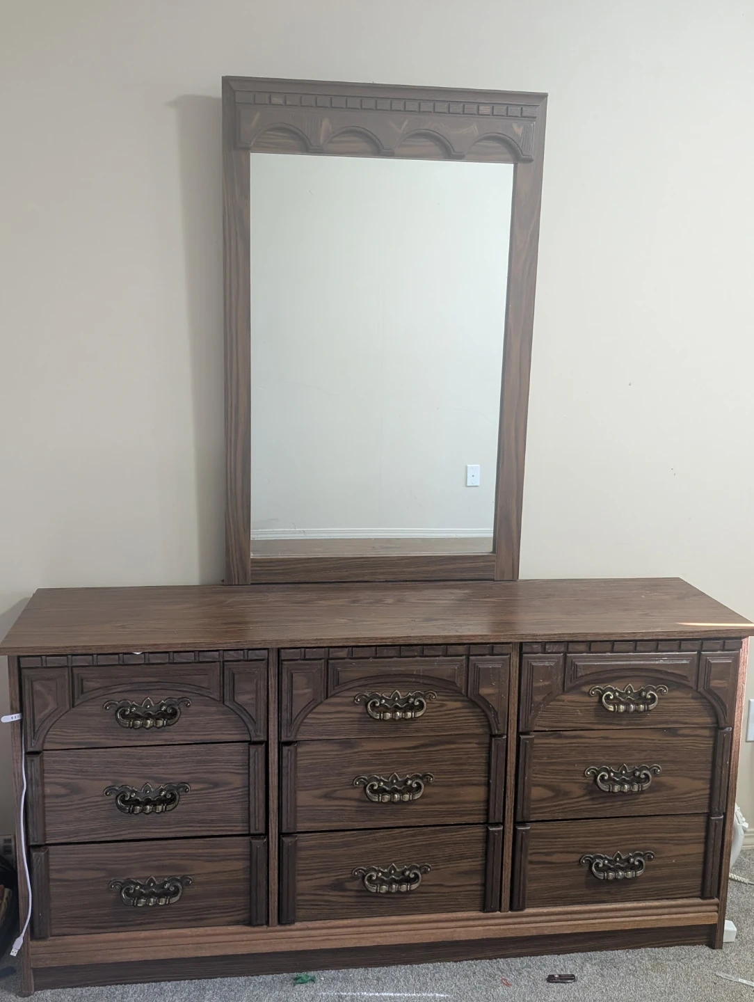 A classic dark brown wooden dresser featuring six drawers and an attached mirror. It's made of wood and has ornate brass-coloured hardware. This dresser would be great for organizing bedroom essentials.