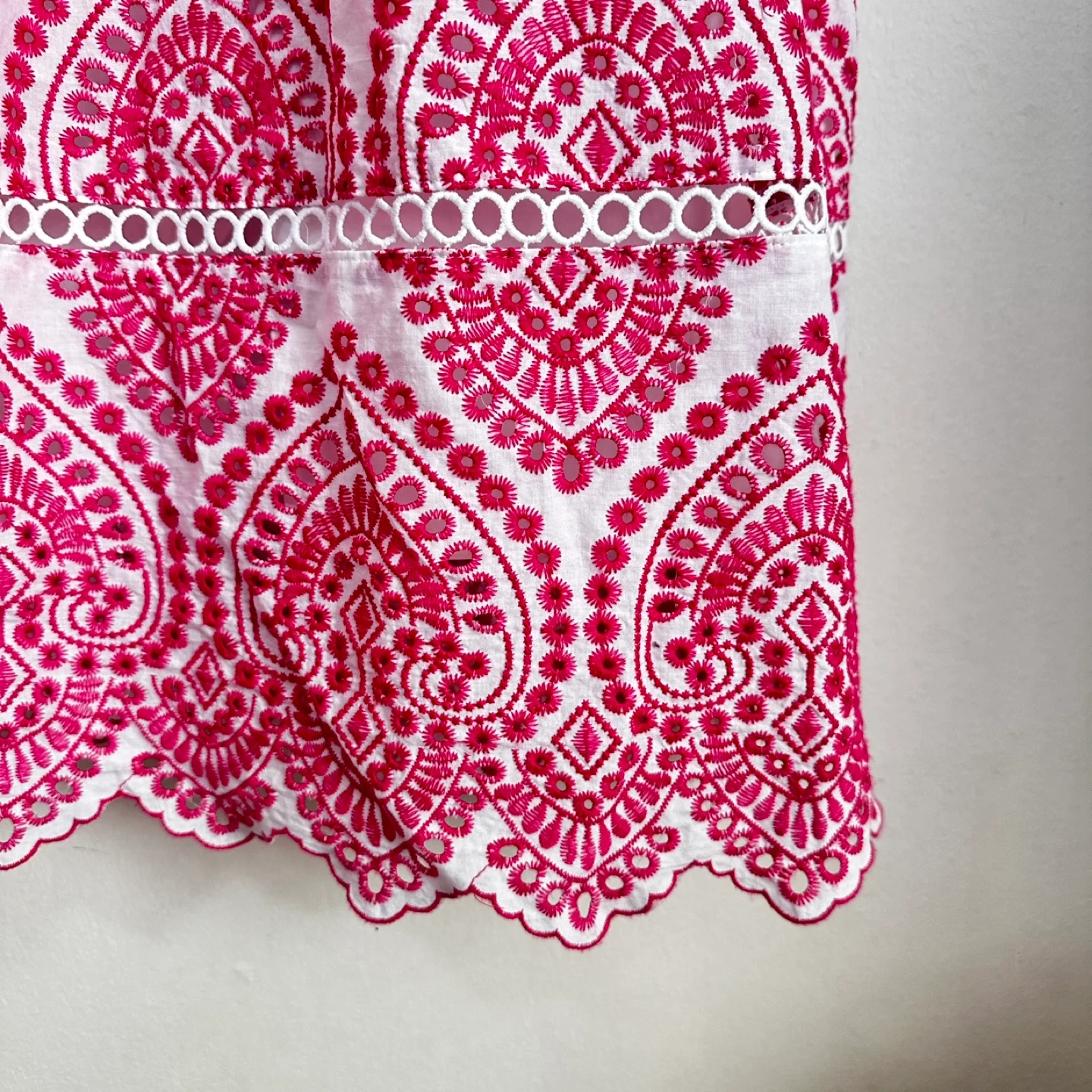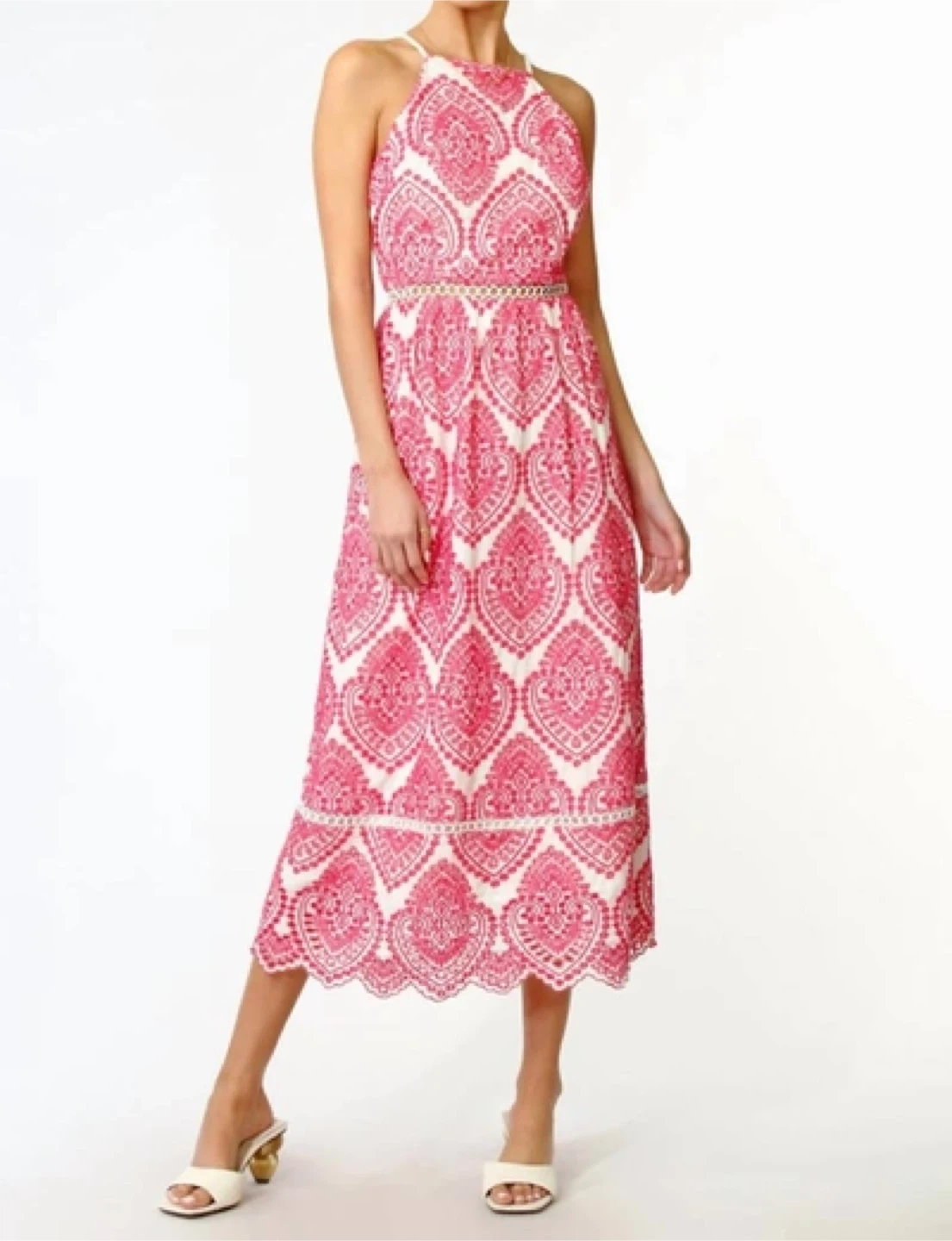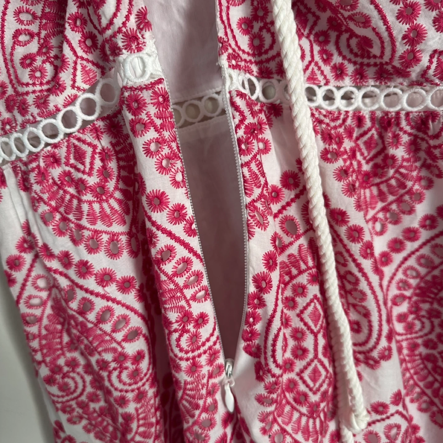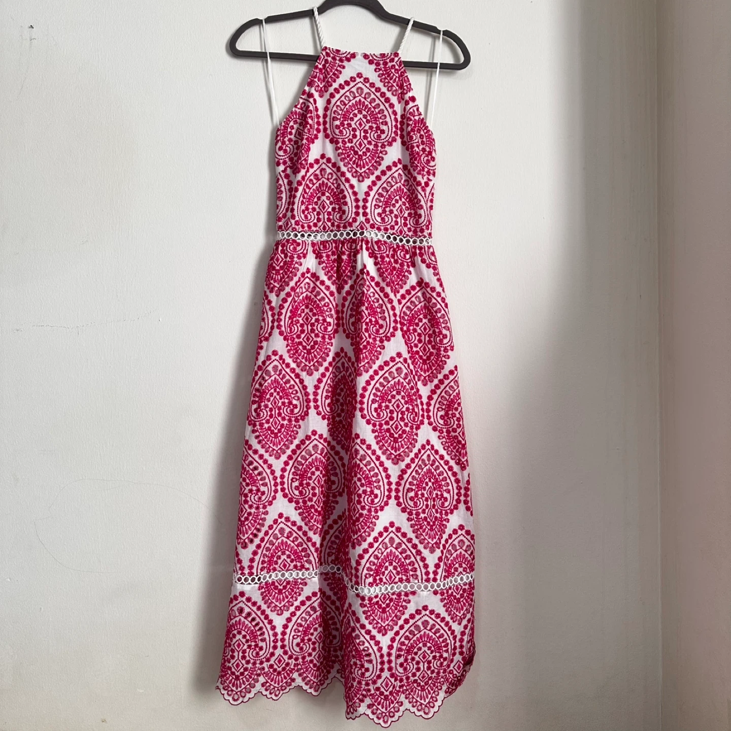 Cotton eyelet dress. Sleeveless. Embroidered. Halter. Midi. Invisible zipper (functional as shown in photos). Lined. 100% Cotton. Lining - 100% Rayon. Hand wash. Size small