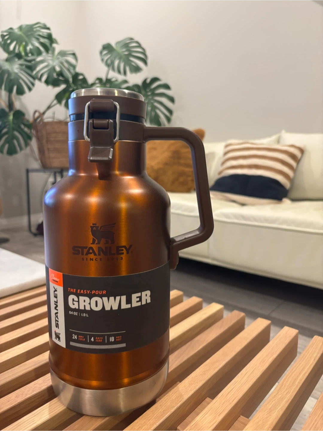 This is a copper-coloured Stanley growler with a 1.9 L capacity. It's designed for easy pouring and keeps drinks cold for up to 24 hours or hot for up to 18 hours.