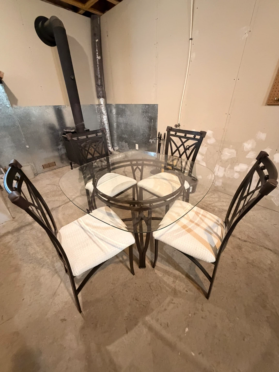 Round glass top dining table set with four metal frame chairs. Chairs have upholstered seats and backs. Perfect for a breakfast nook or small dining area!
