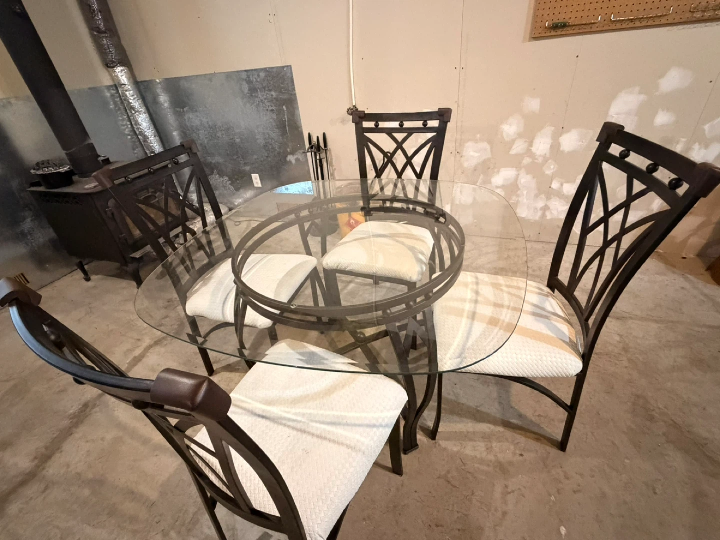 Round glass top dining table set with four metal frame chairs. Chairs have upholstered seats and backs. Perfect for a breakfast nook or small dining area!