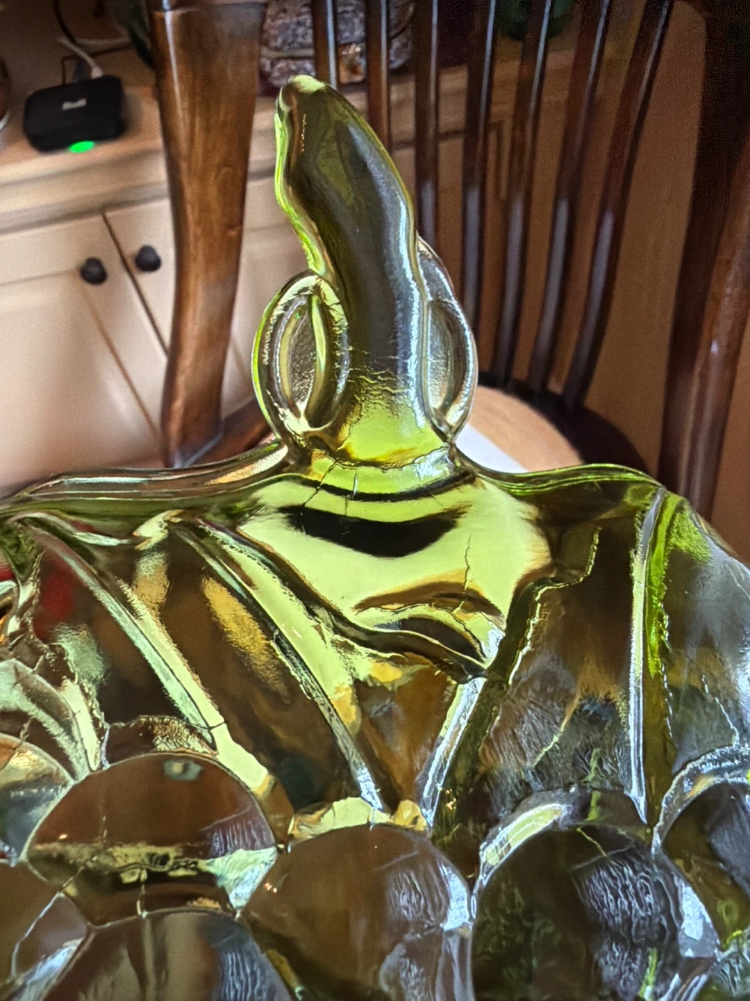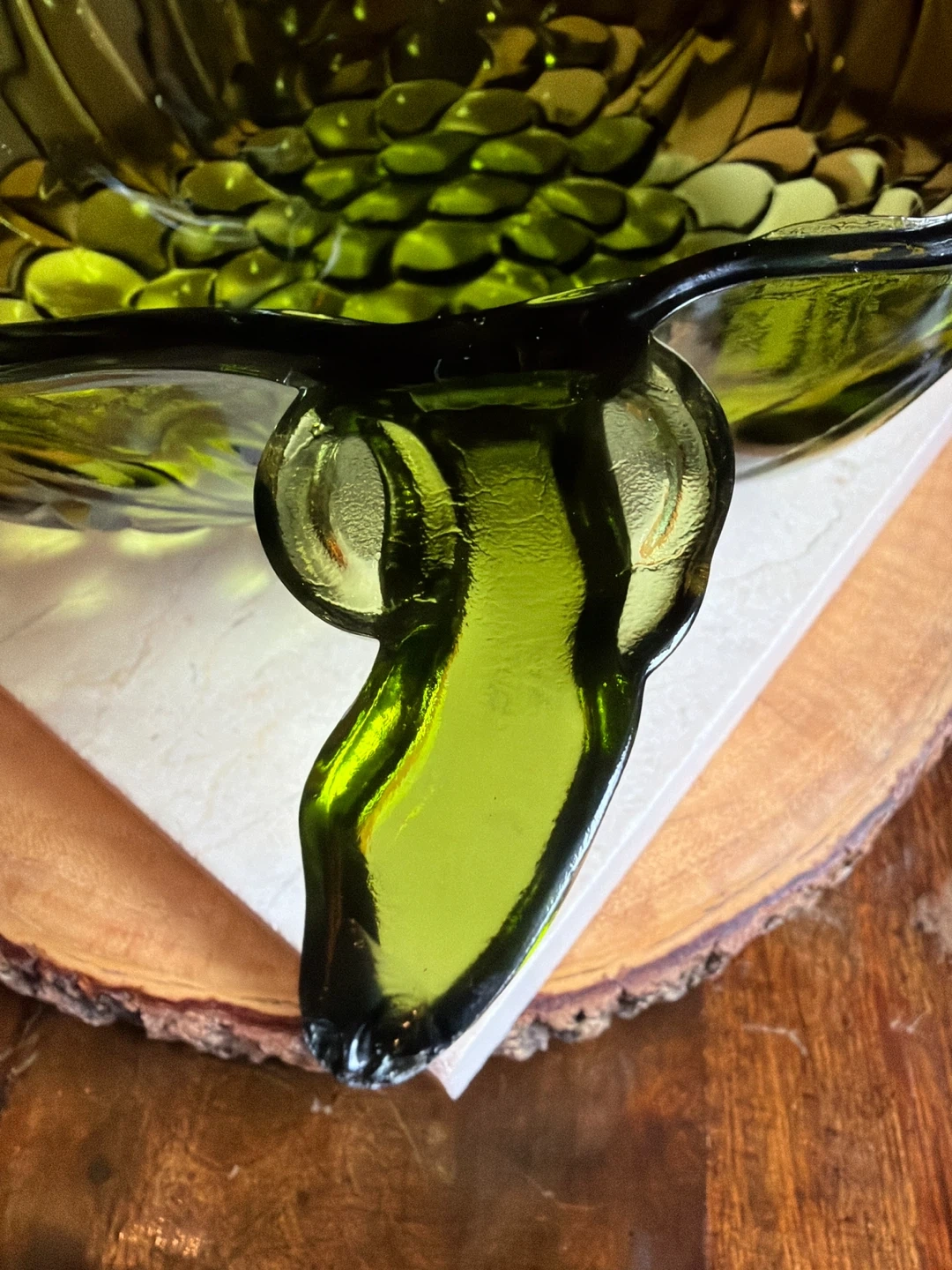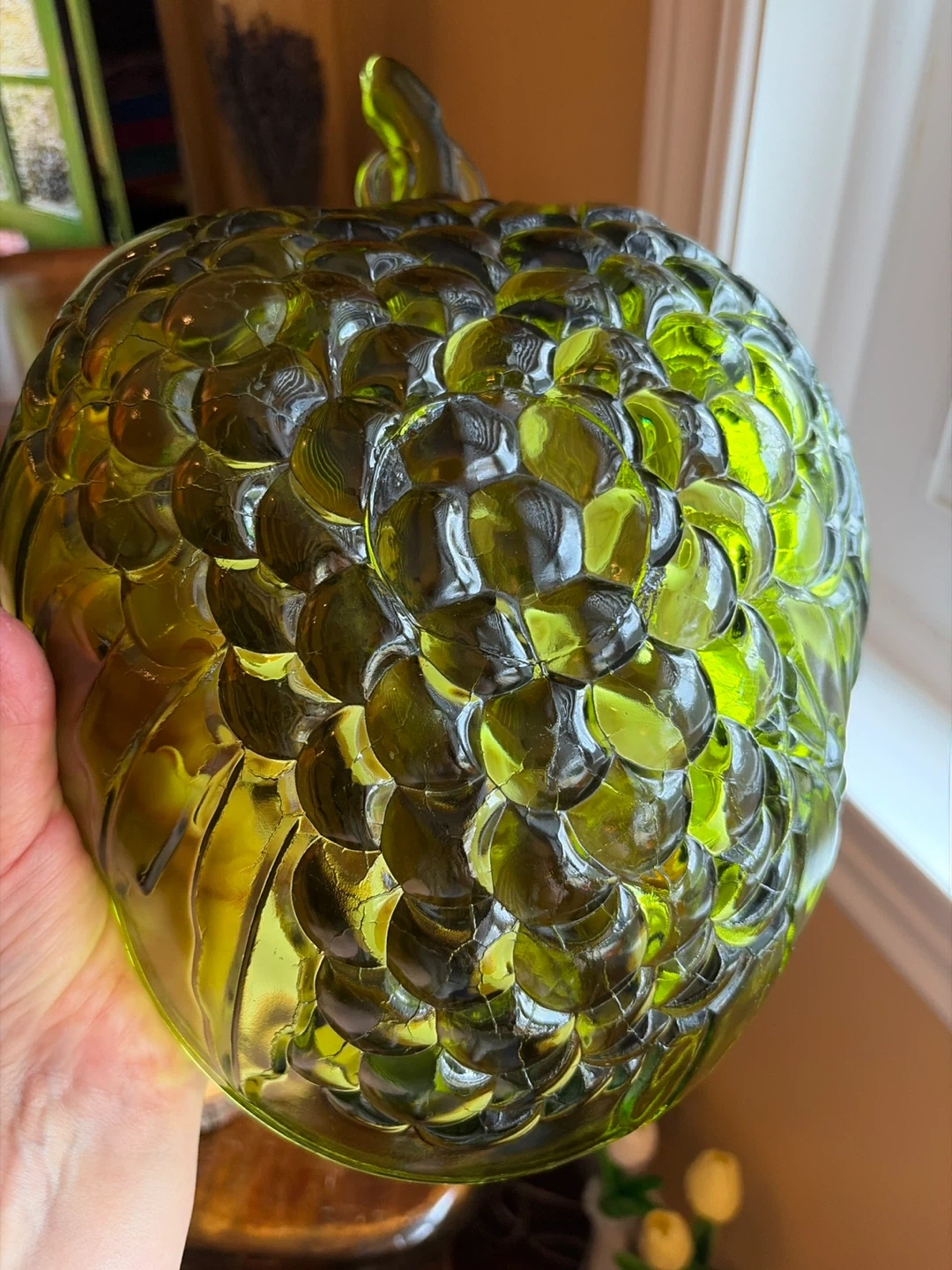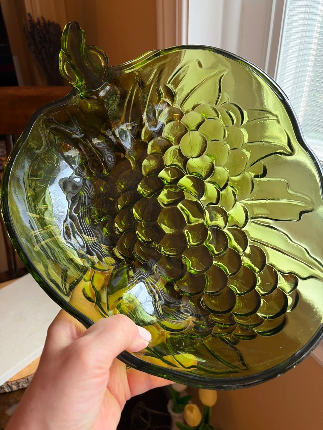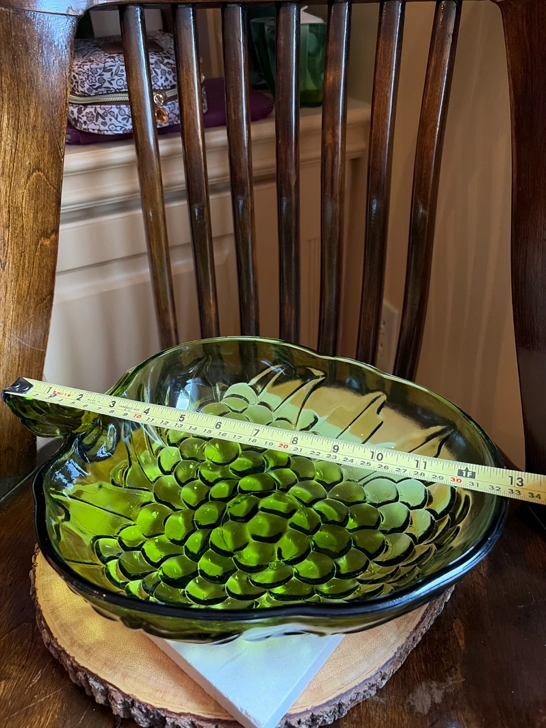 This beautiful vintage Indiana glass serving bowl features a charming grape cluster shape and design embossed on the interior. It's made of a sturdy avocado green glass and shaped like a leaf with a stem handle. It is made in the 1970’s so there are a few tiny flea bites but otherwise in great condition (see pics). It is 13” from stem to bottom and 9” wide at the widest area and about 3” tall. It's perfect for serving salads, as a fruit bowl or as a decorative centrepiece!