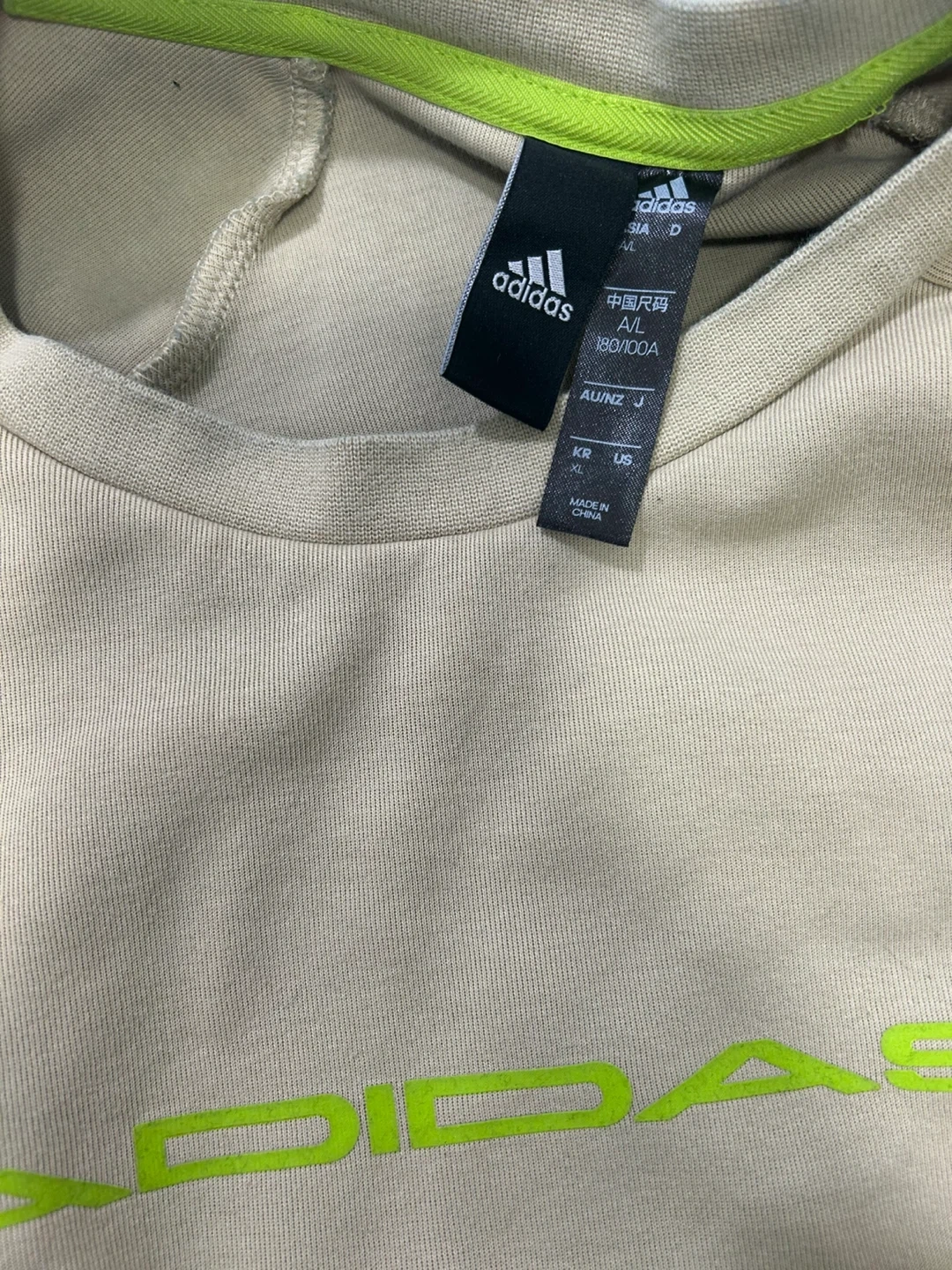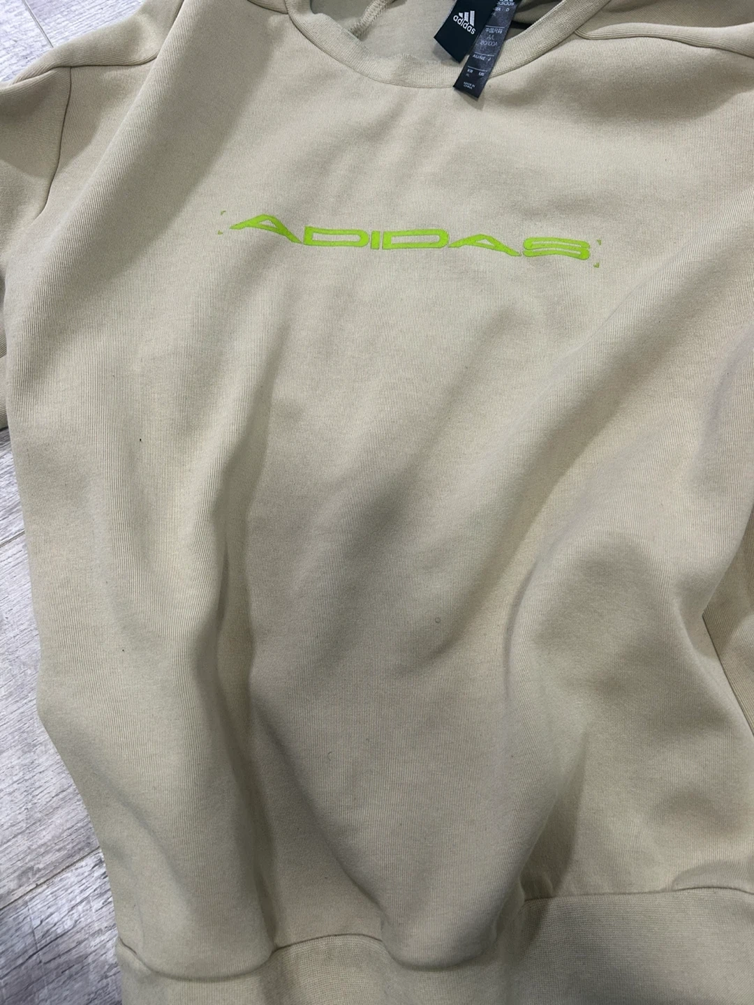 65Selling a comfy Adidas hoodie in a neutral beige colour. It's a size Medium. The Adidas logo is featured in a bright neon green colour. Perfect for layering!
