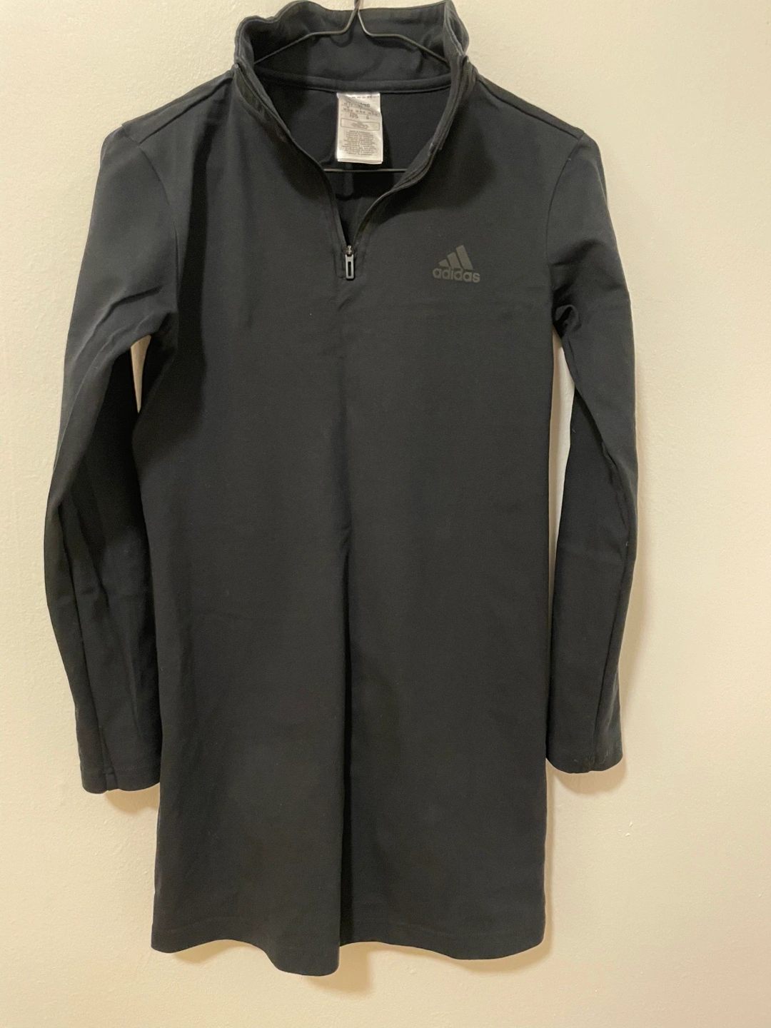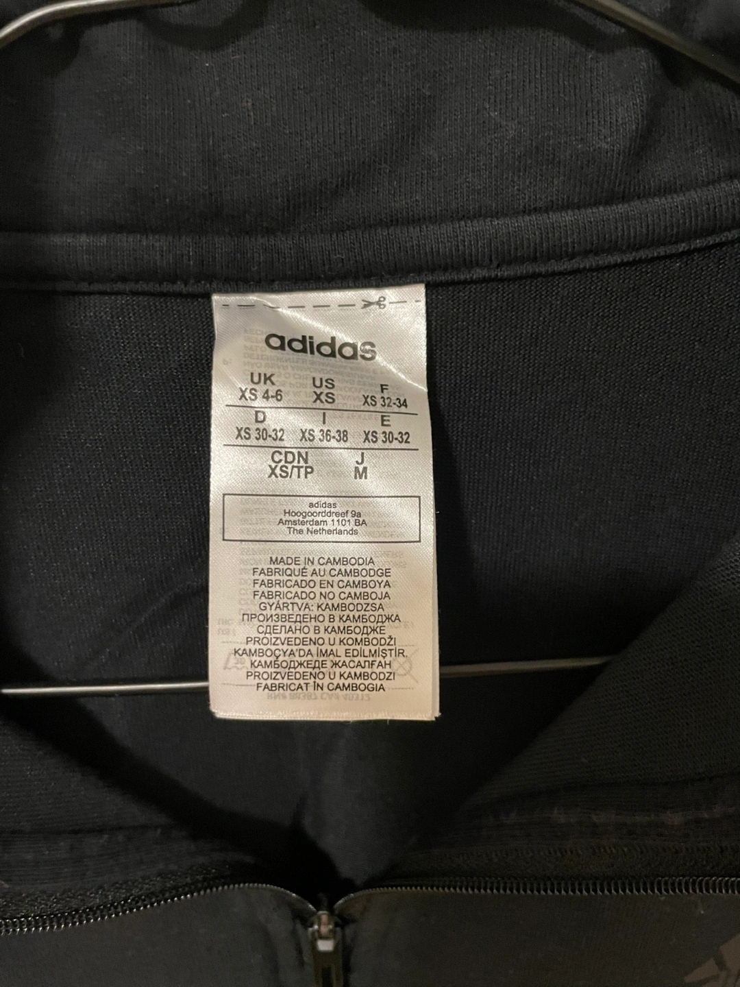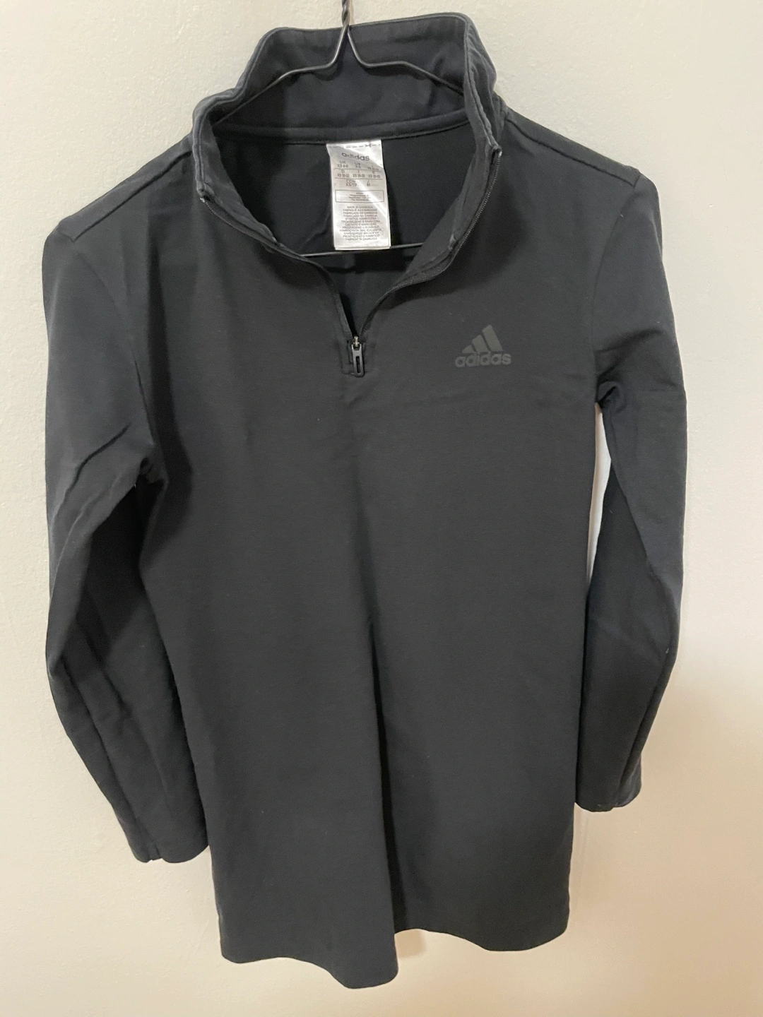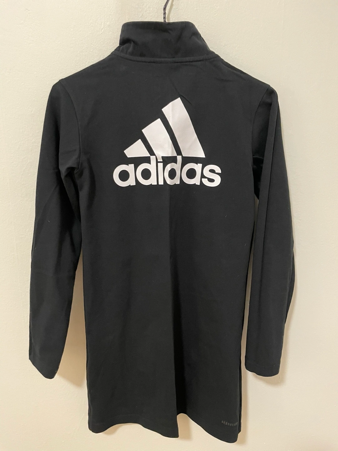Black Adidas long-sleeve top. Quarter zip closure. Small Adidas logo on the chest and large logo on the back. Size XS. Made in Cambodia.