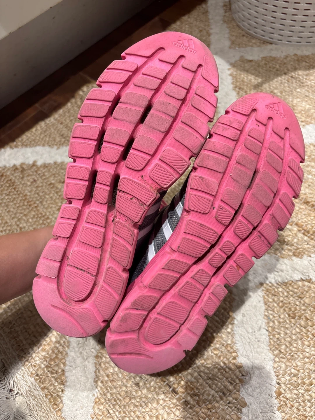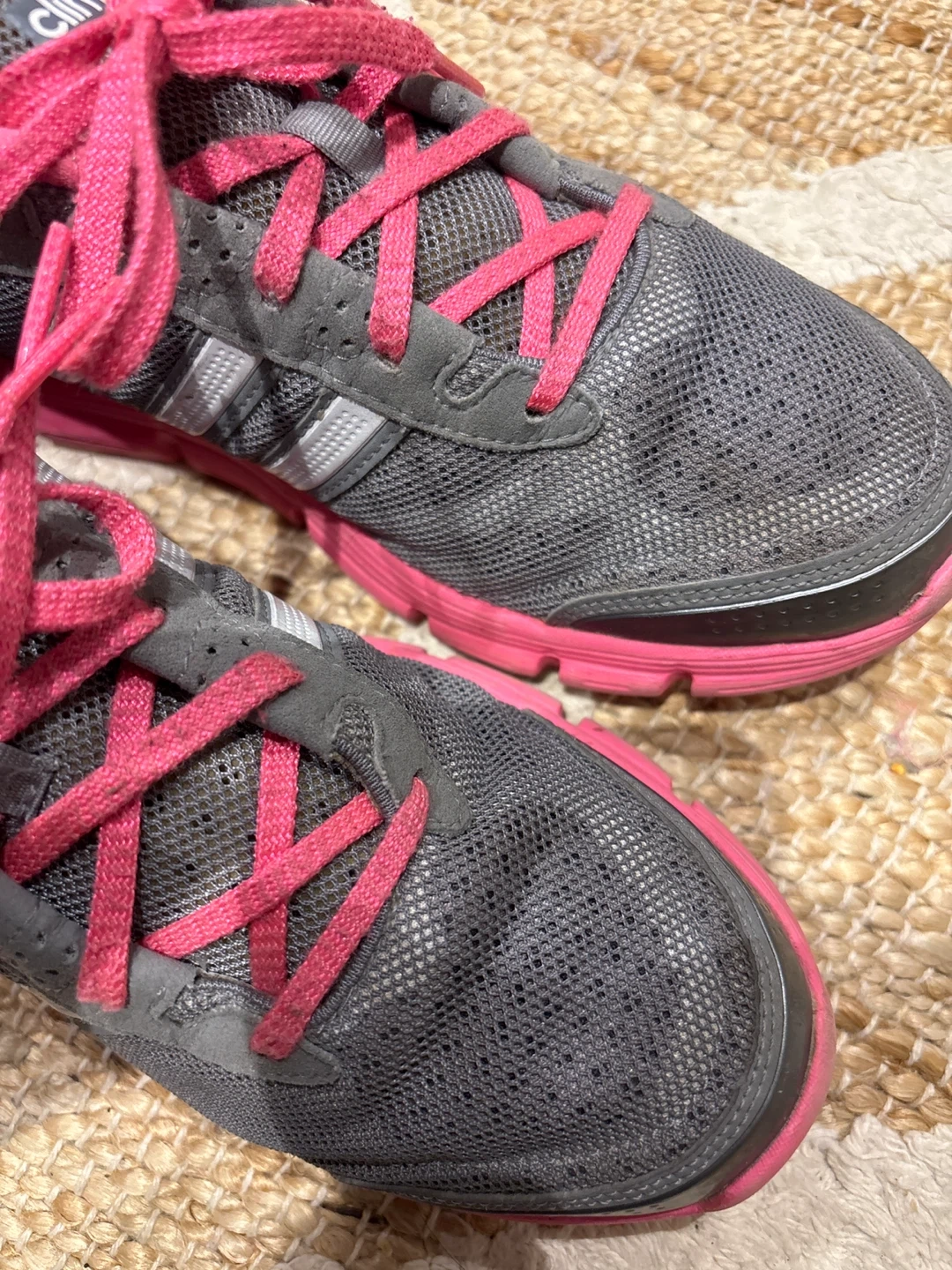 272Selling a pair of Adidas Climacool running shoes in grey and pink! They're in used condition, as you can see from the soles, but still have lots of life left. Size US 9.5