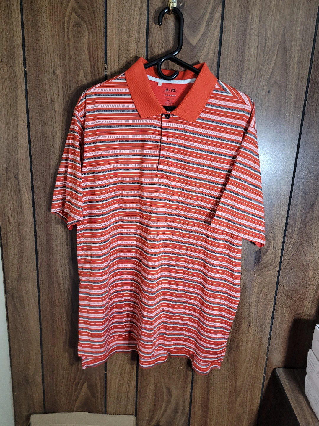 197Selling an Adidas ClimaCool golf polo shirt in size XL. It features a striped pattern and the Adidas logo. Great for a round of golf or casual wear!