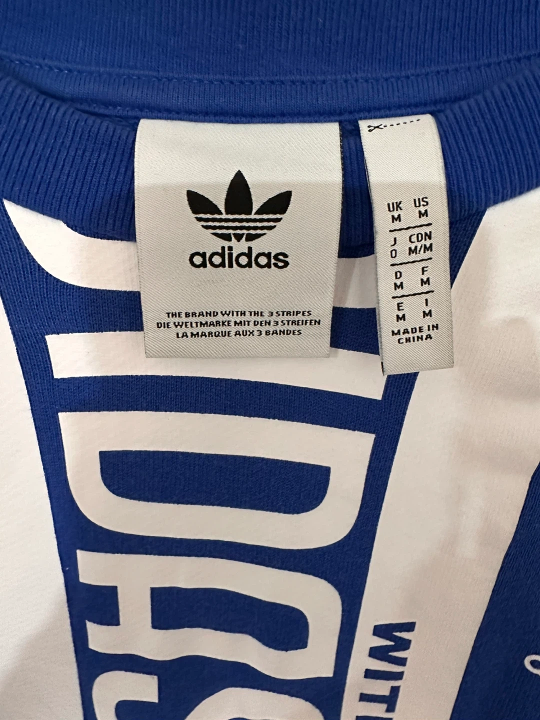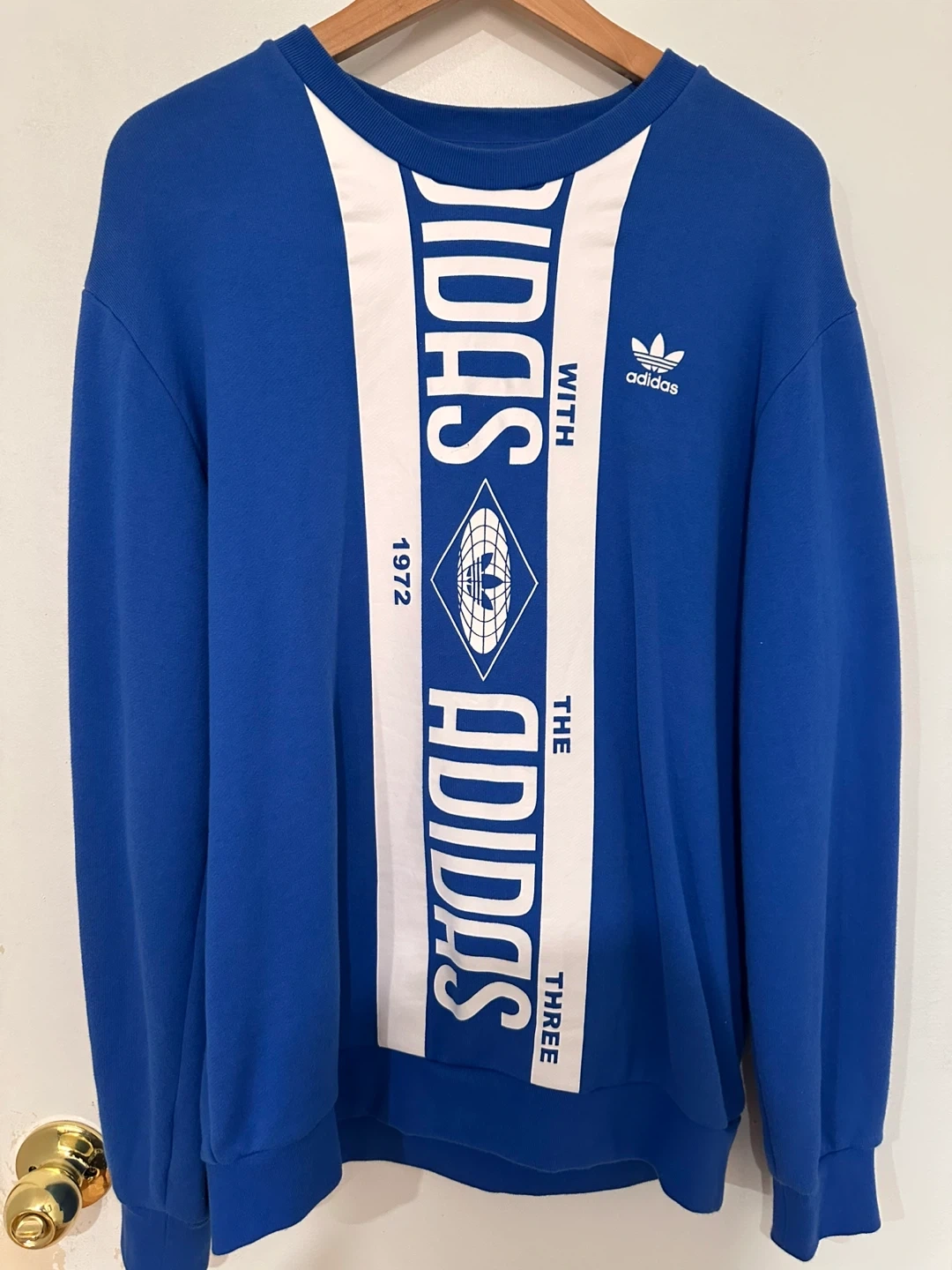 10This is an Adidas crewneck sweatshirt in size medium. It features a blue and white design with the Adidas logo.