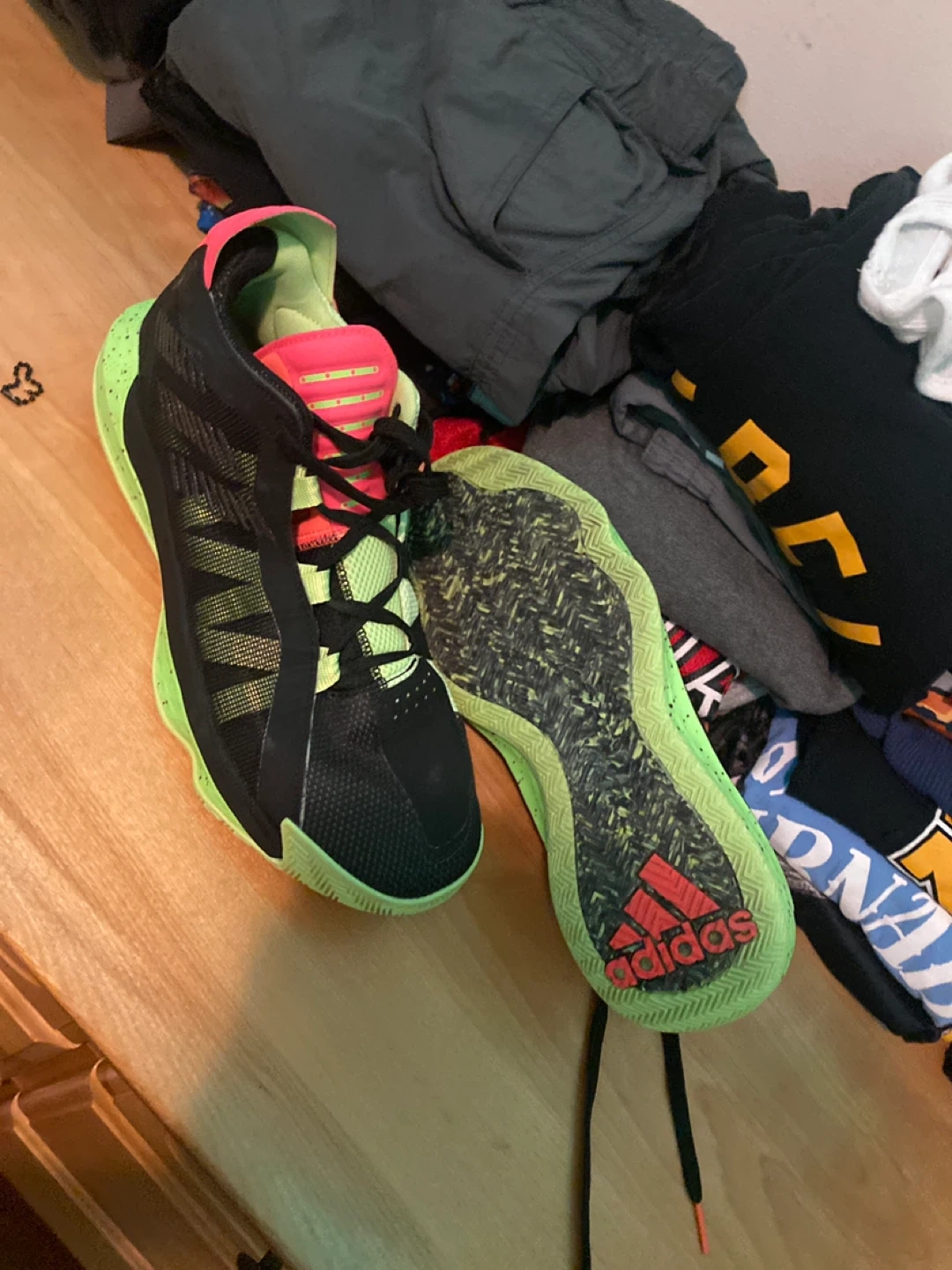 10Selling a pair of Adidas Dame 6 basketball shoes. They feature a black and neon green colourway with a red Adidas logo on the sole. Great for playing ball or casual wear!
