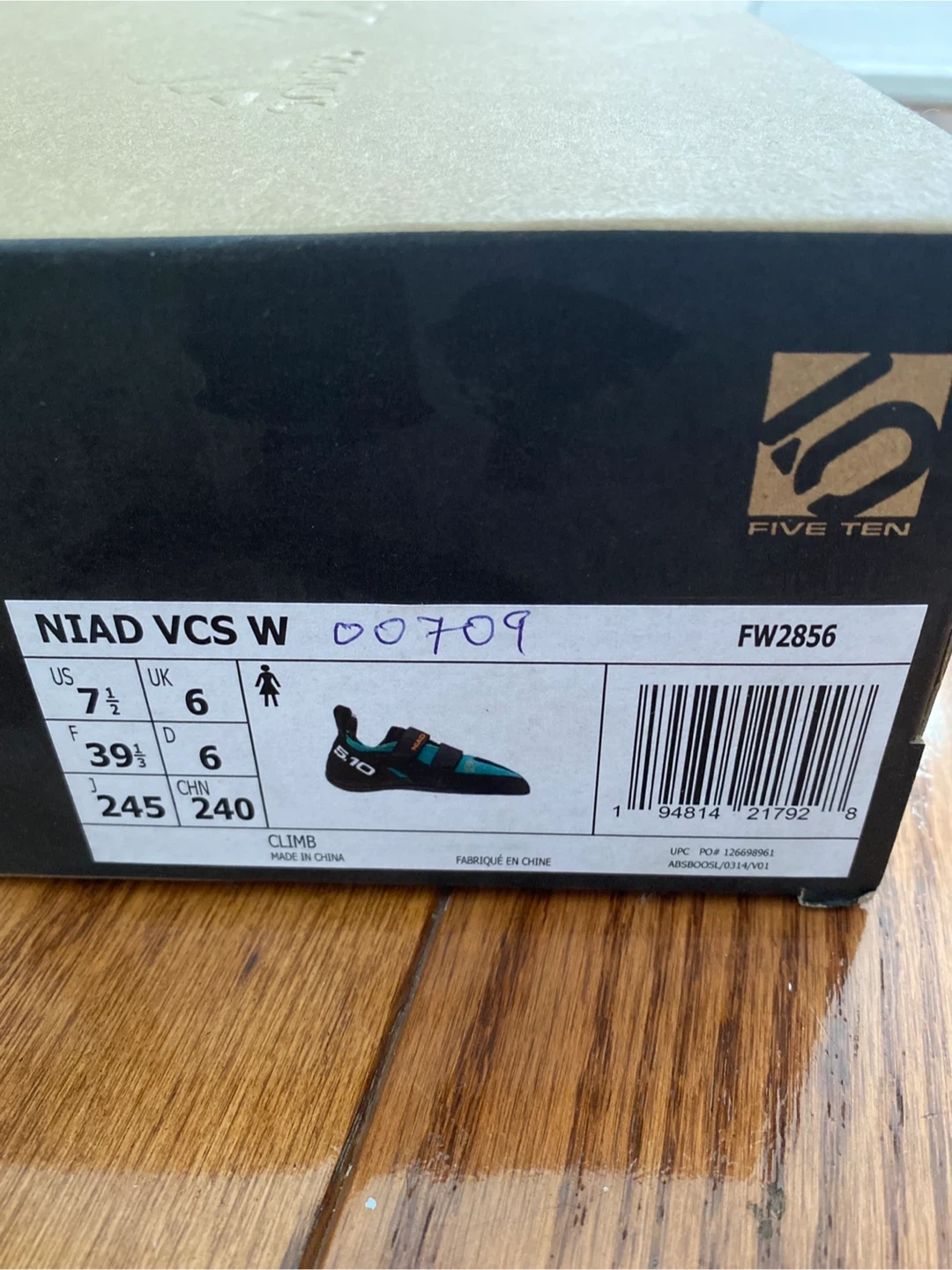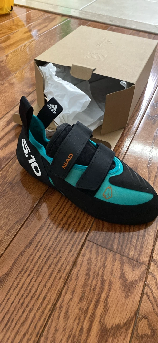 10Selling a pair of Adidas Five Ten Niad VCS W climbing shoes! They are a women's US size 7.5. The shoes are in Brand New condition and come with the original box. Perfect for hitting the climbing gym or the crag!