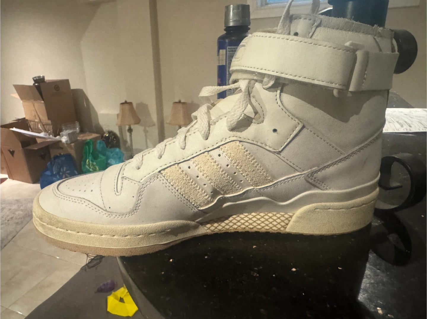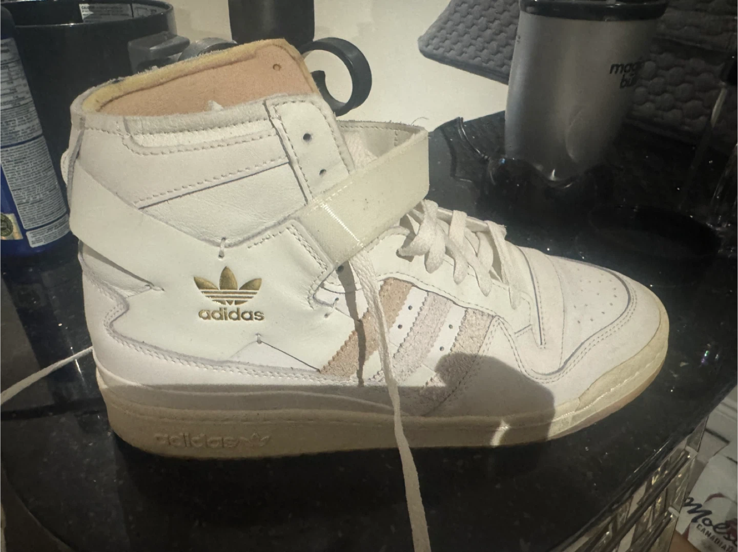 10Selling a pair of Adidas Forum high top sneakers. They're in good condition and ready for a new home! The classic design features the iconic three stripes and a comfortable fit. Perfect for everyday wear or hitting the court!
