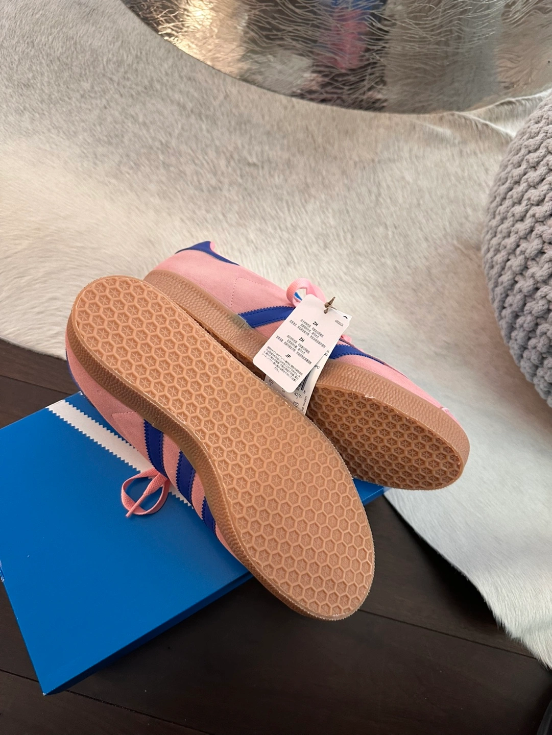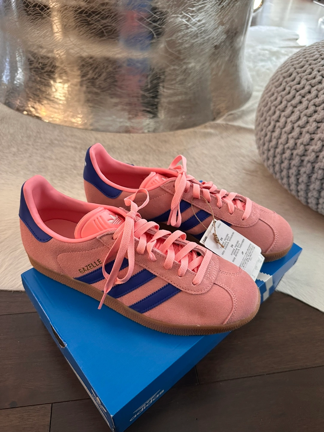 10Adidas Gazelle sneakers. Size 9 Pink suede upper with blue accents. New with box. Brand new bought a men’s 9 instead of a women’s 9. Asking $90