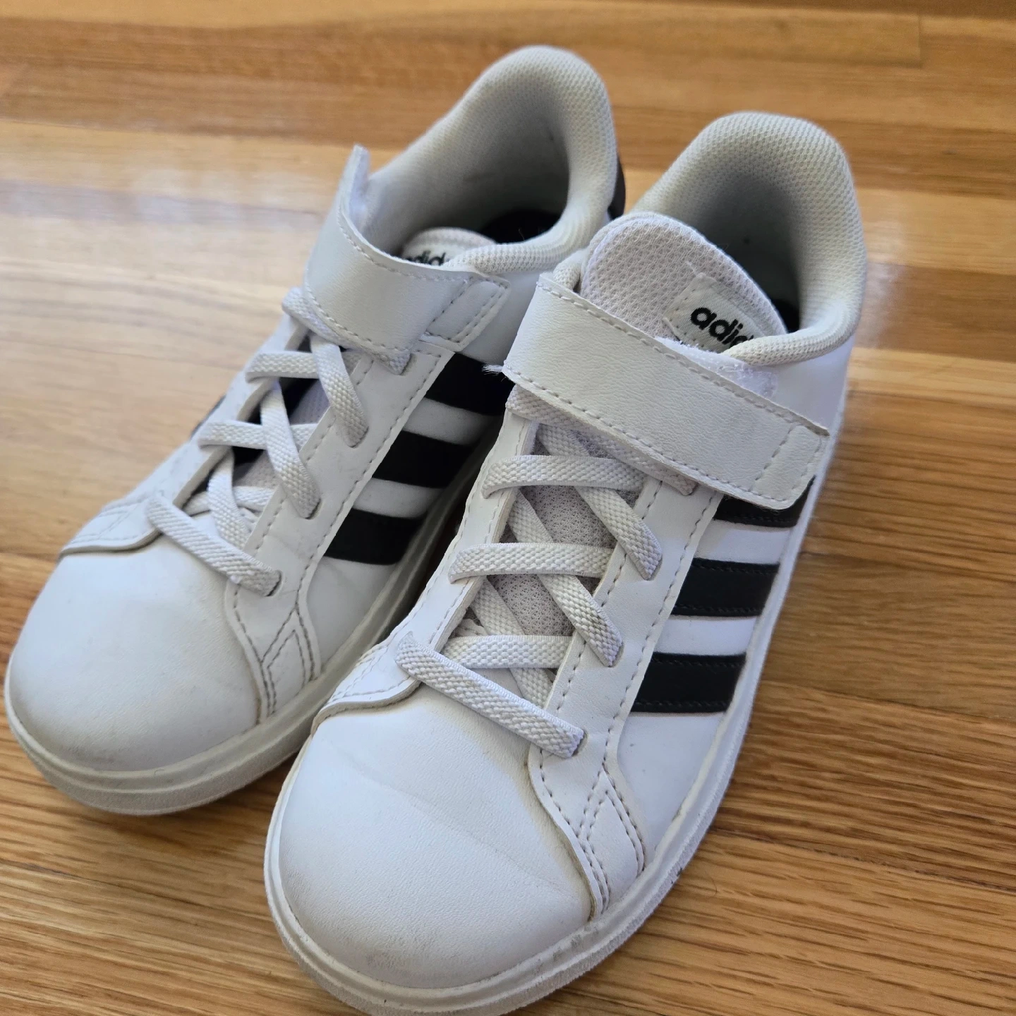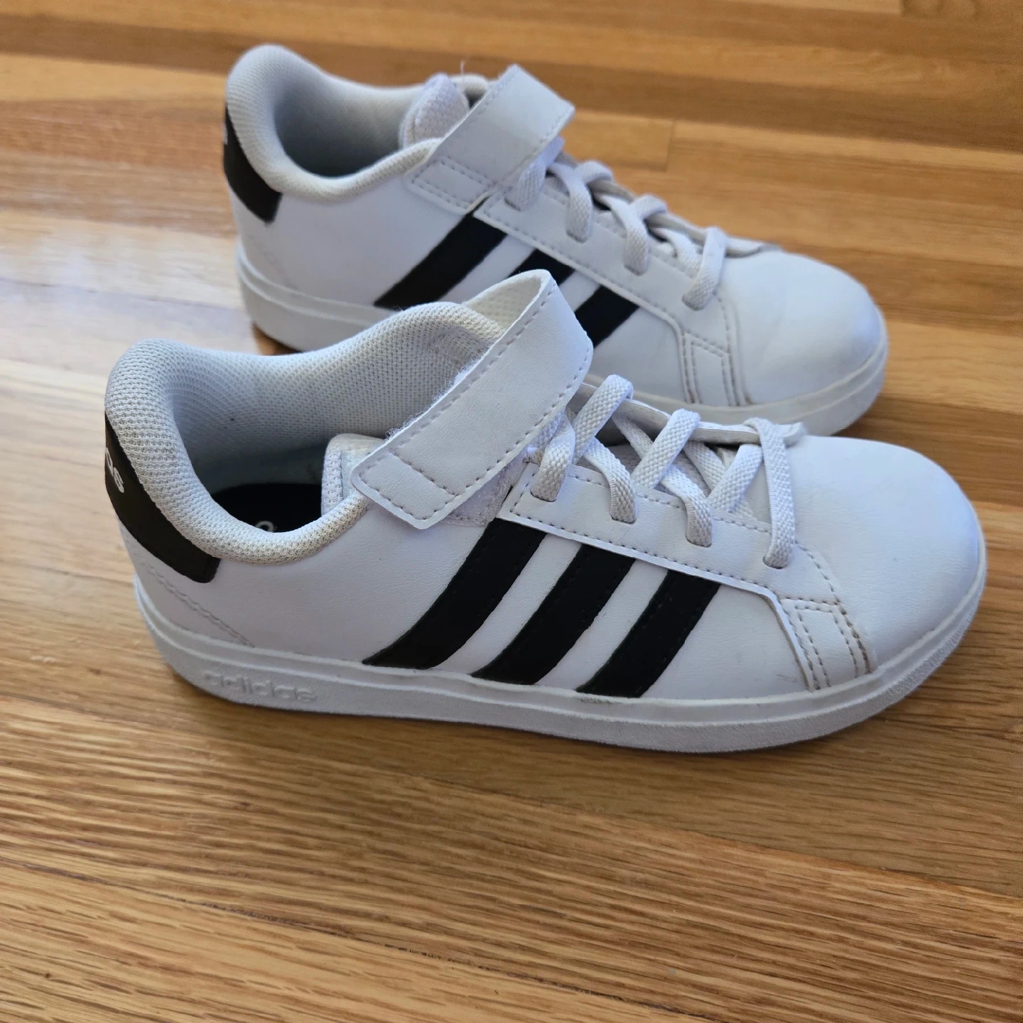 60Selling a pair of Adidas Grand Court kids sneakers in size 13K. They are white with black stripes and in good condition. Perfect for your little one!