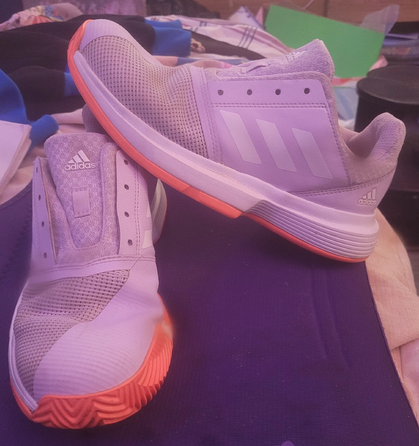 Selling a pair of Adidas tennis shoes in a light grey colour with orange soles. They're in good condition and ready for the court. size 6 us