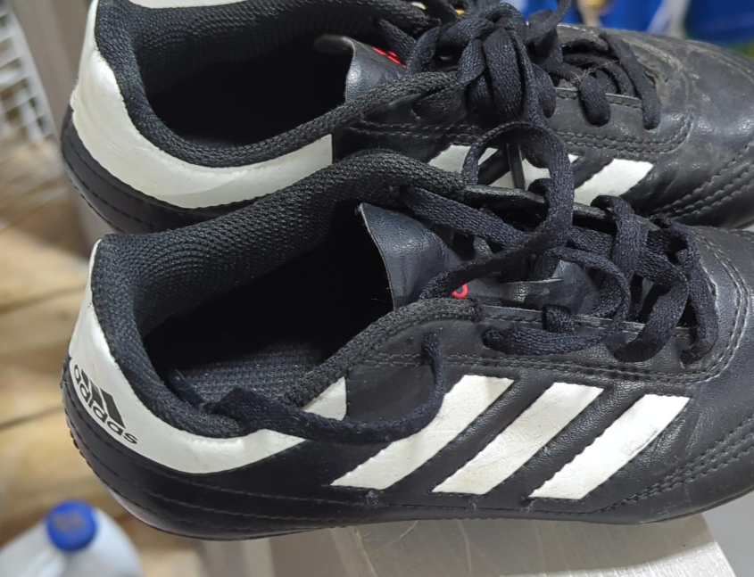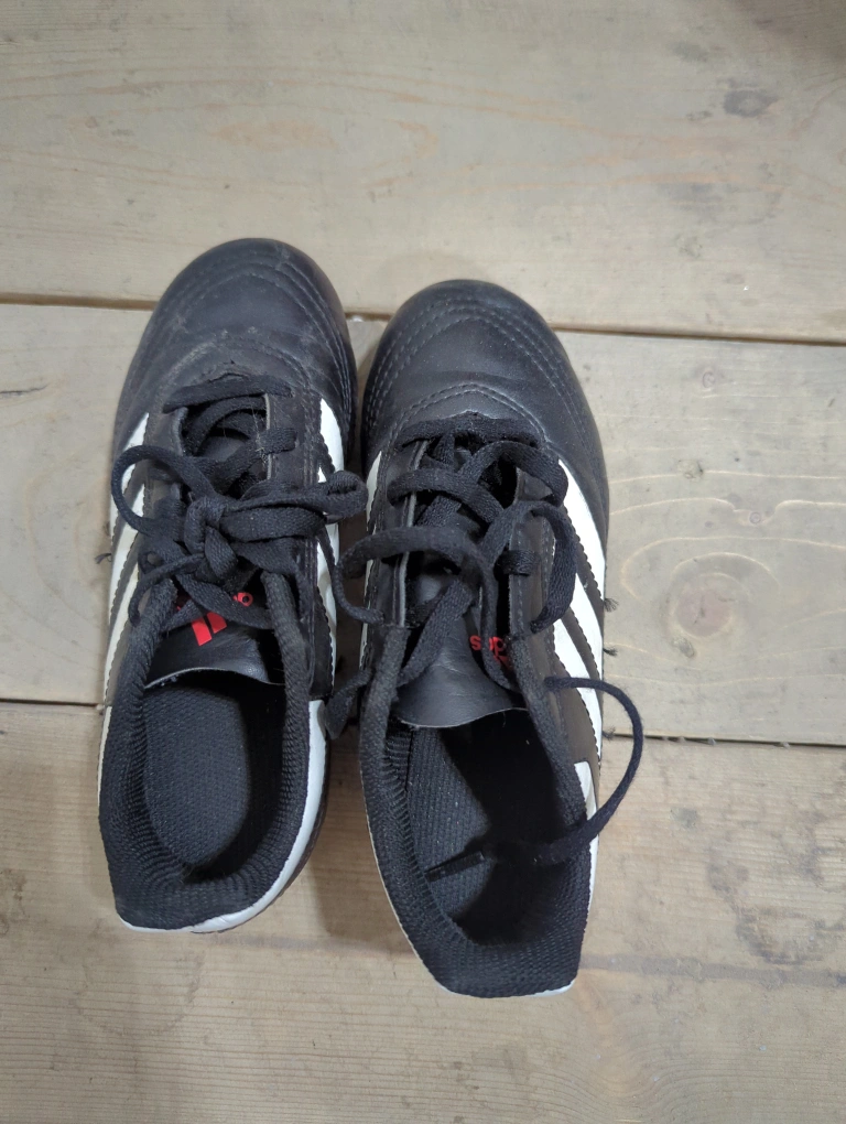 Selling a pair of Adidas kids' soccer cleats. They are black with white stripes. There are some signs of wear on the soles and uppers. Still lots of life left in them for your little soccer star! Size 13 US(kids)