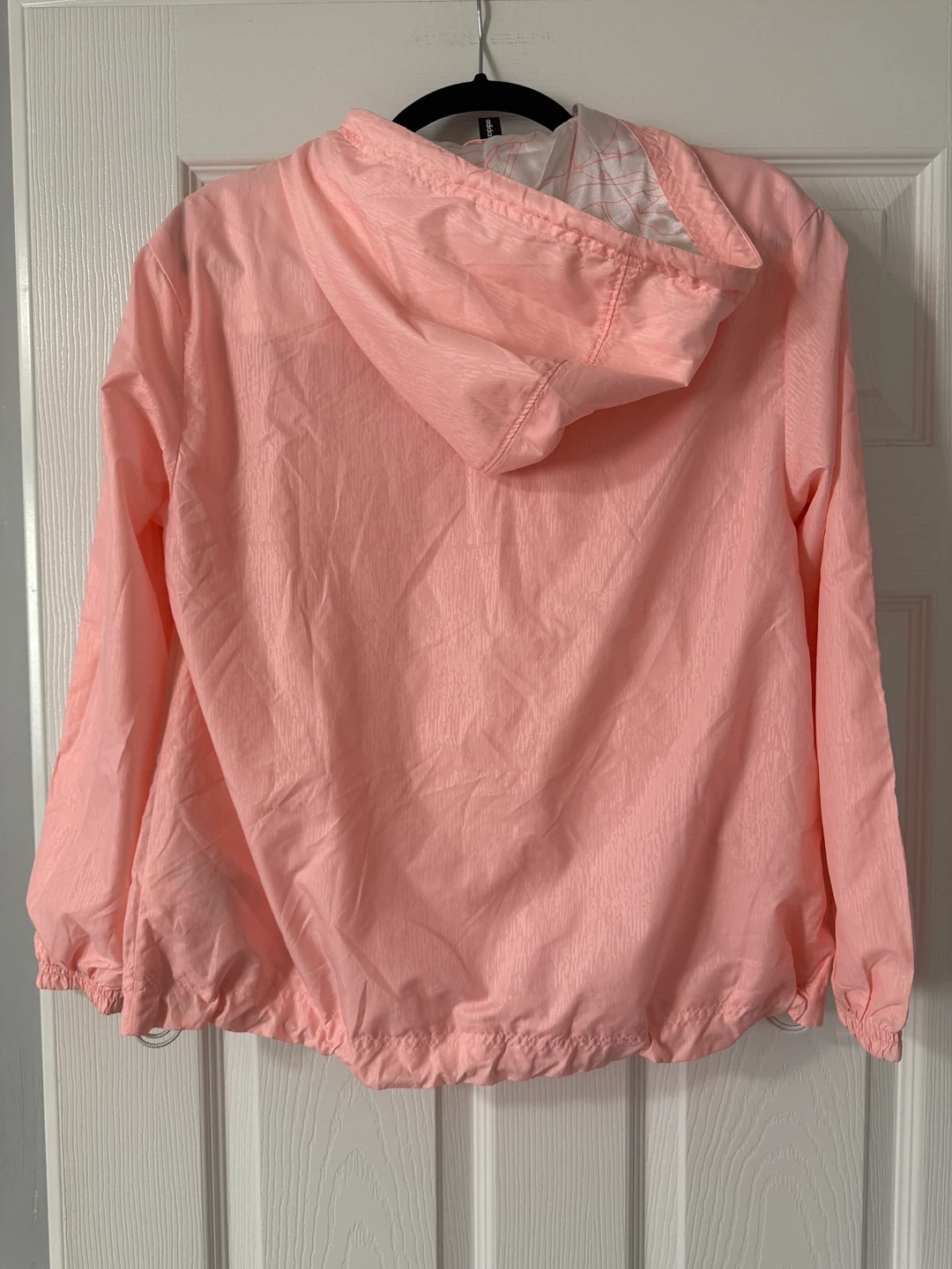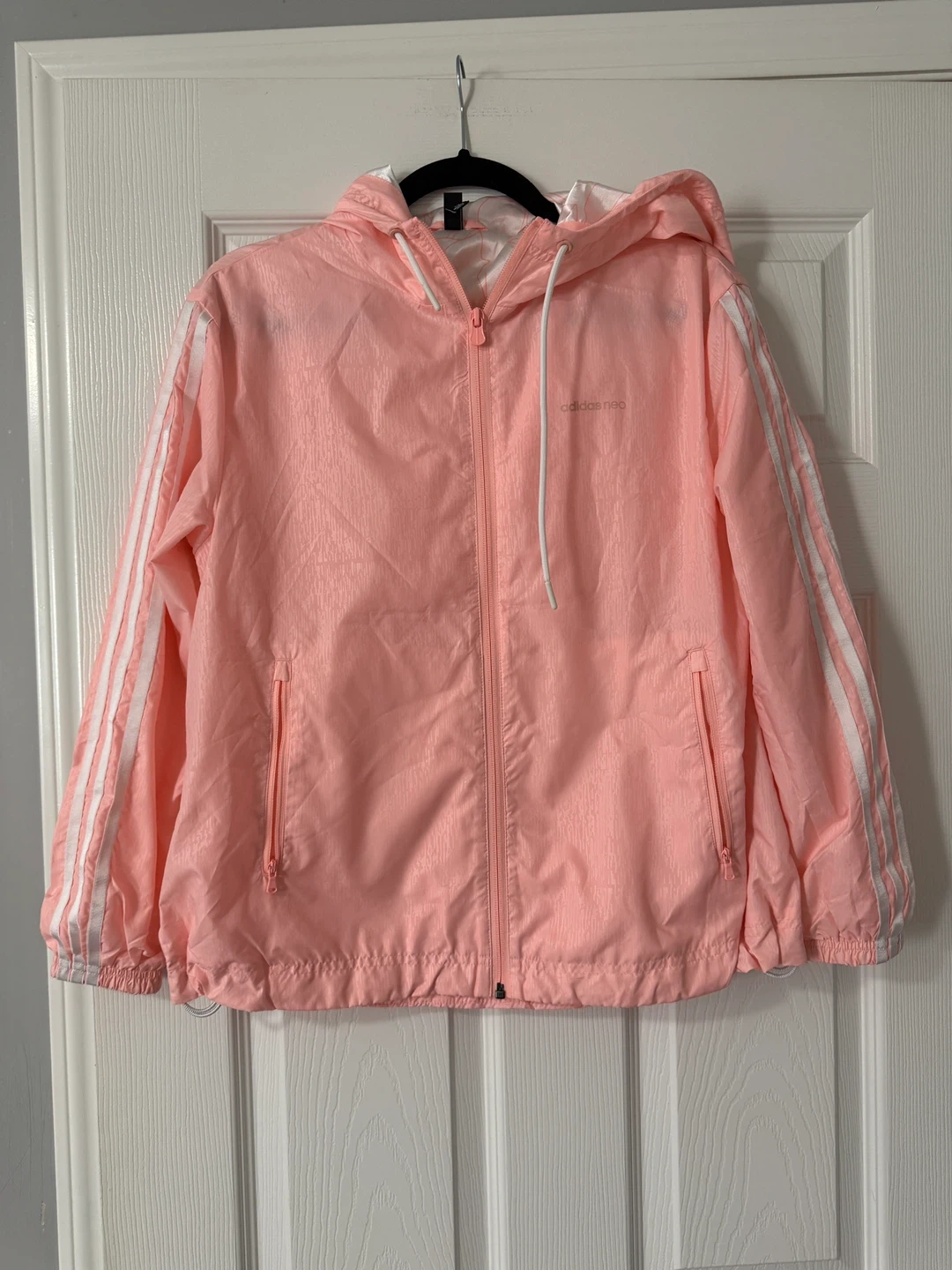 25Adidas Neo windbreaker in a lovely pink colour! It's a size small and made with 100% polyester for the shell and hood lining. Great for layering or wearing on breezy days