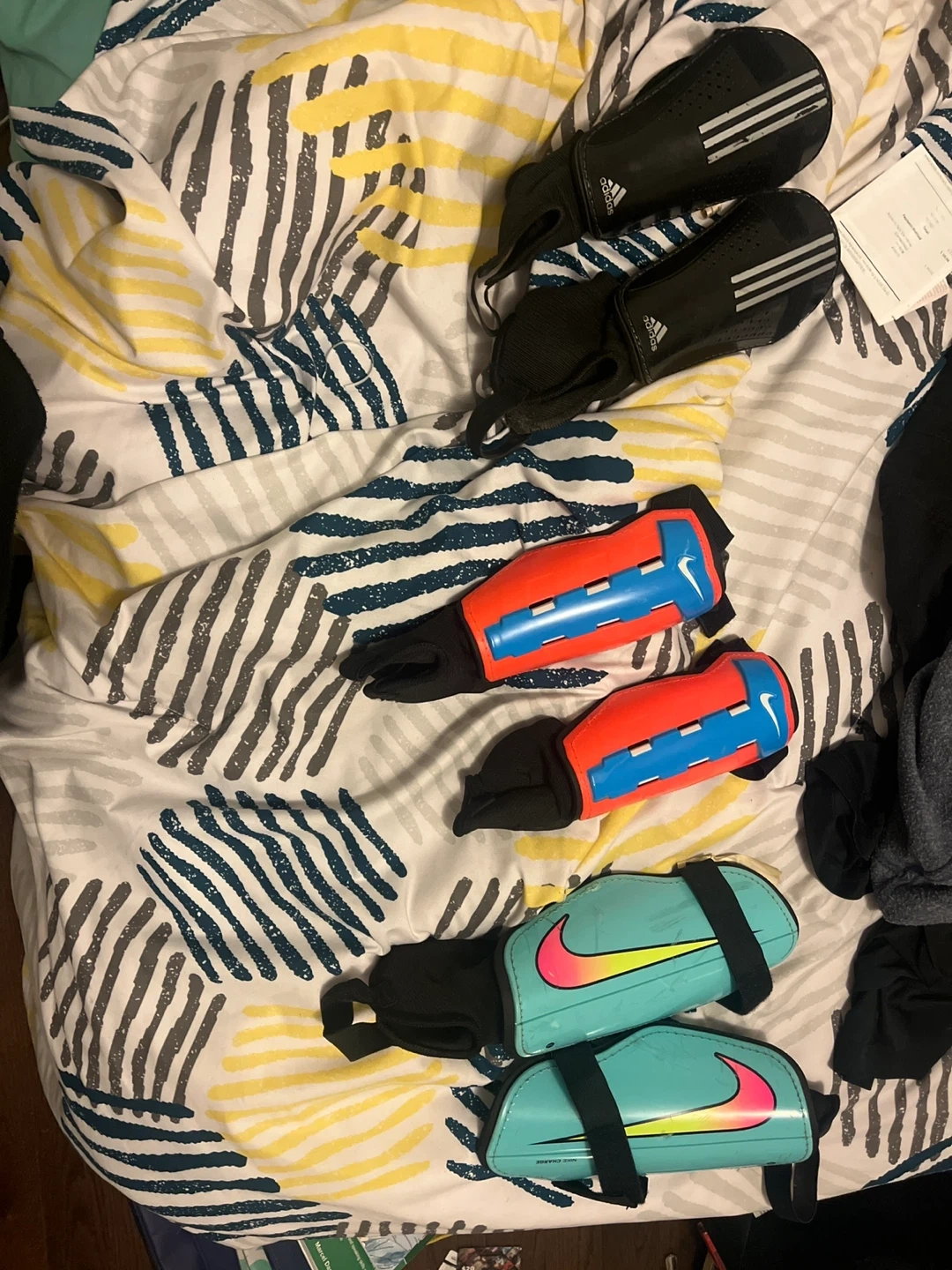 10Selling a set of soccer shin guards! There are two pairs: one Adidas (black with white stripes) and one Nike (light blue with pink and yellow swoosh). Both are in good condition and ready for the field