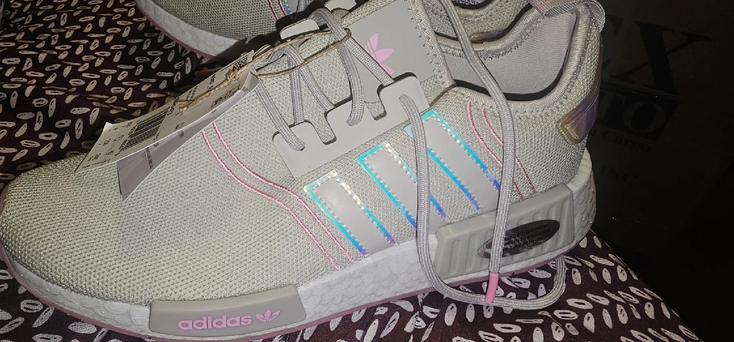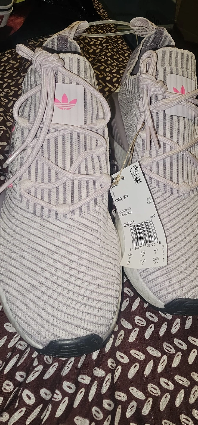 Selling a pair of Adidas NMD W1 women's sneakers! They are a lovely light grey colour with pink accents. Size 8.5 US. These shoes are in great condition and ready for a new home