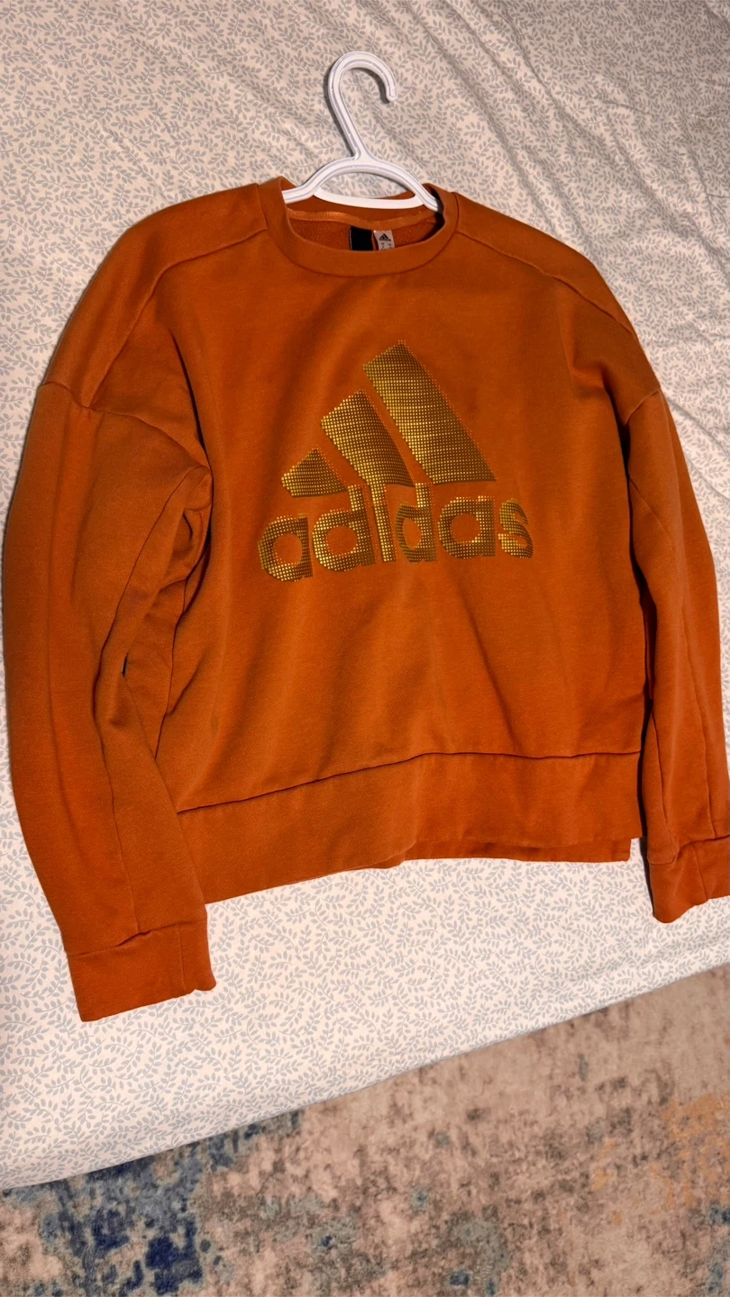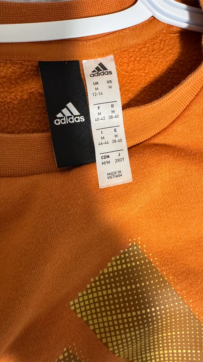 15Cozy Adidas crewneck sweatshirt in a lovely orange colour! It's a size medium and features the classic Adidas logo in a gold-ish colour. Perfect for staying comfy and stylish!