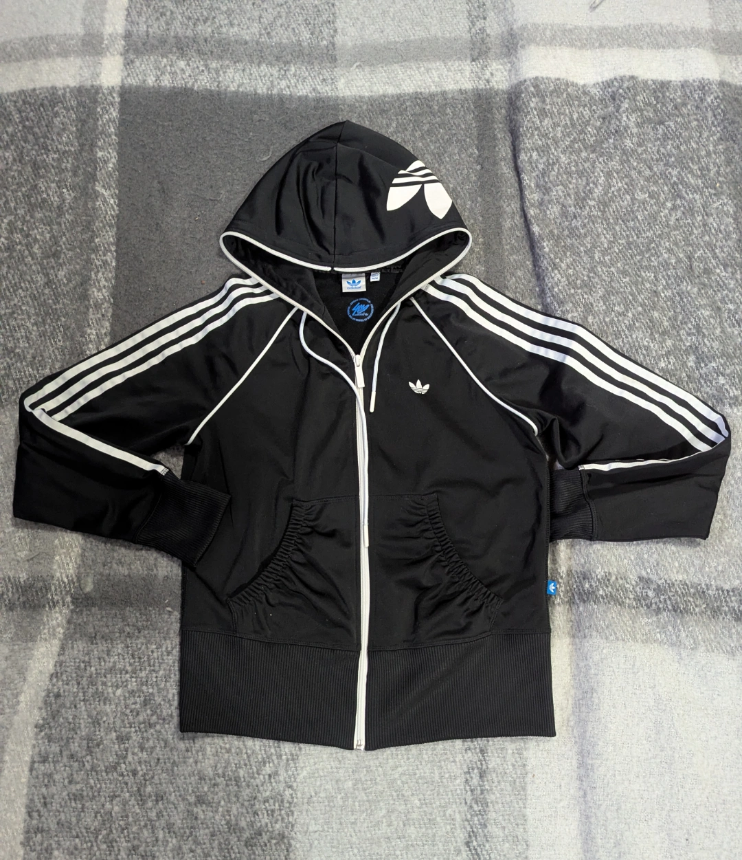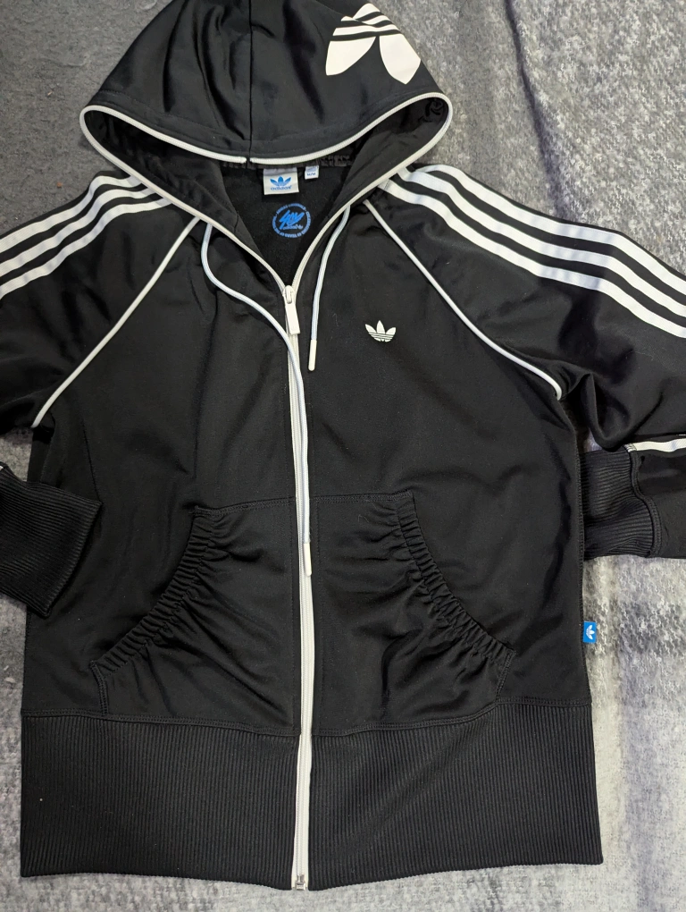 65Selling a gently used rare Adidas Originals track jacket in black with white. It's a size medium and features the classic three stripes down the sleeves and the Adidas logo, with a feminine twist. Perfect for workouts or casual wear! Like new condition.