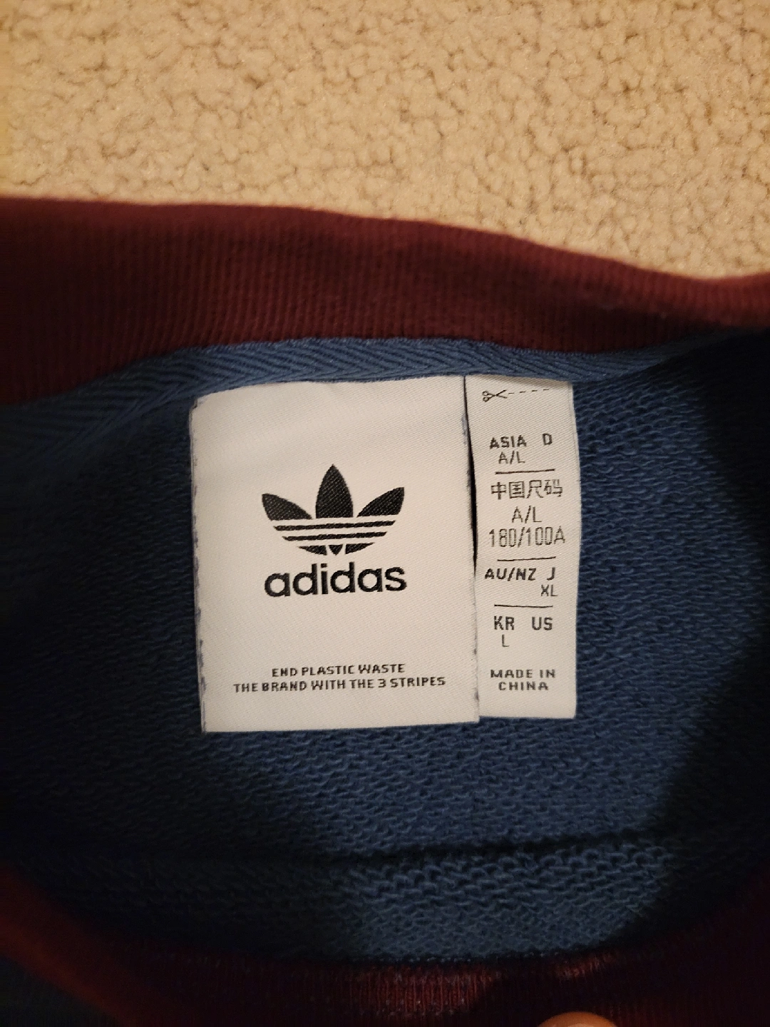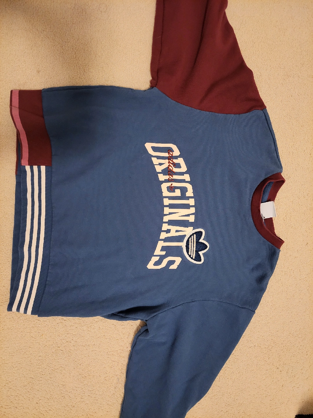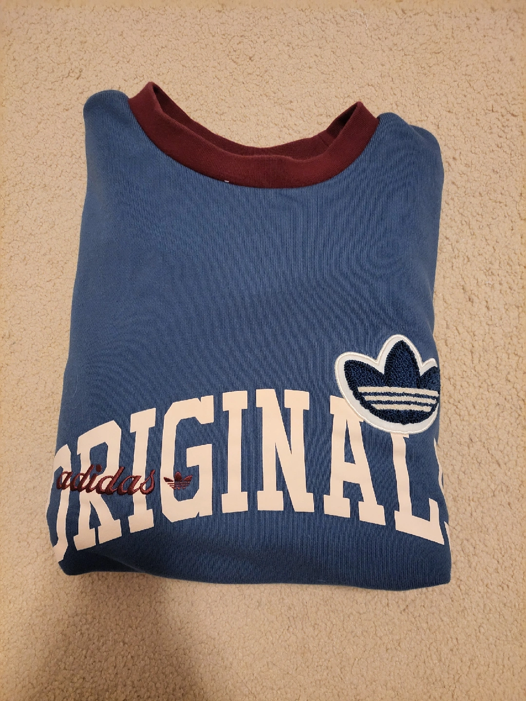 15This Adidas Originals crewneck sweatshirt features a stylish colourblock design in blue and maroon! It's a size L and in great condition. The iconic Adidas logo is prominently displayed on the front. Perfect for adding a retro touch to your wardrobe!