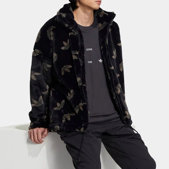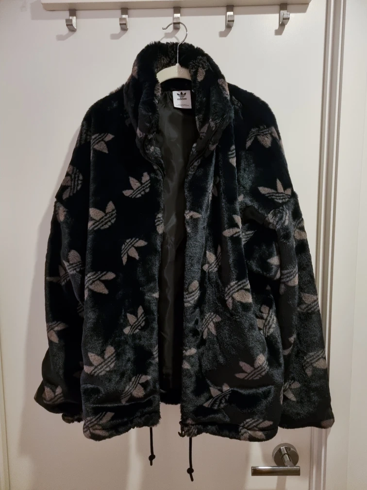 21Size : Large This is an authentic Adidas Originals jacket with the all-over Trefoil monogram pattern. Color: Black/Brown monogram Material: Very warm and soft faux fur Condition: Worn only a few times, in perfect condition (no stains or damage). Pickup only & Cash only